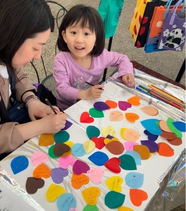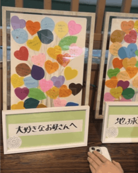 私は、地域の方々と共に笑顔の創作イベントを開催しました。日頃なかなか伝えられない母への感謝の気持ちを形にする場として企画したものです。参加者の言葉を一枚の絵にまとめて、おとぎの森公園内に展示し、想いを共有しました。
