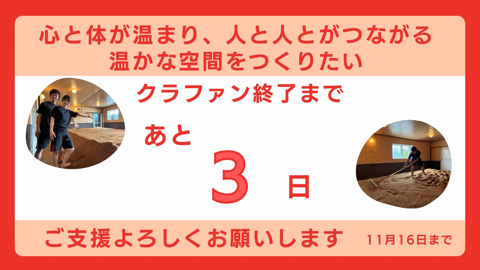 2025/11/09 18:29いつも温かい応援をありがとうございます!クラウドファンディングも残り7日となりました!1日1日、ご支援くださる方が増えていてとってもとってもありがたいです!!なにより、応援したい、少しでも力になってあげたい、酵素風呂に興味を持ってくださる方がこんなにもいてくださることが心の底から嬉しいです!これまで数え切れないくらいの困難にぶつかり、たくさんの人に支えられてここまでこれました。まだまだこれから。むしろこれからの方が大変なことが多いと思います。まずはオープンに向けて着実に歩んでいきます。みなさまにお会いできる日を楽しみにしながら。。引き続き応援よろしくお願いします! もっと見る