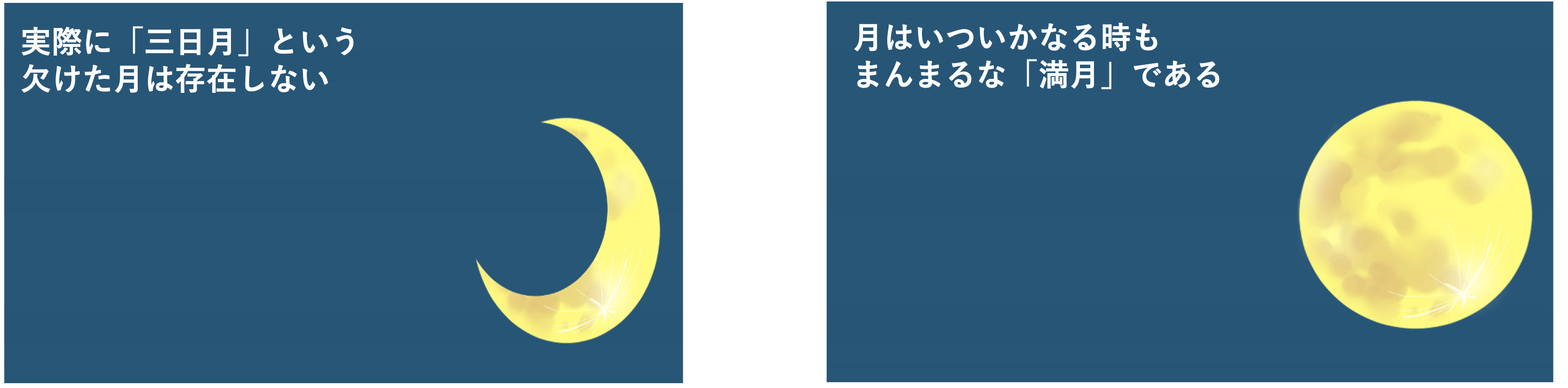 私たち人間の目からはそう見えるだけで実際の形は、いついかなる時も球体でまんまるな「満月」です。