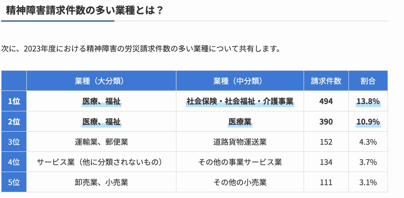 厚労省によると、精神障害の労災件数で「介護・医療業」が、全業種の24.7%を占めています。