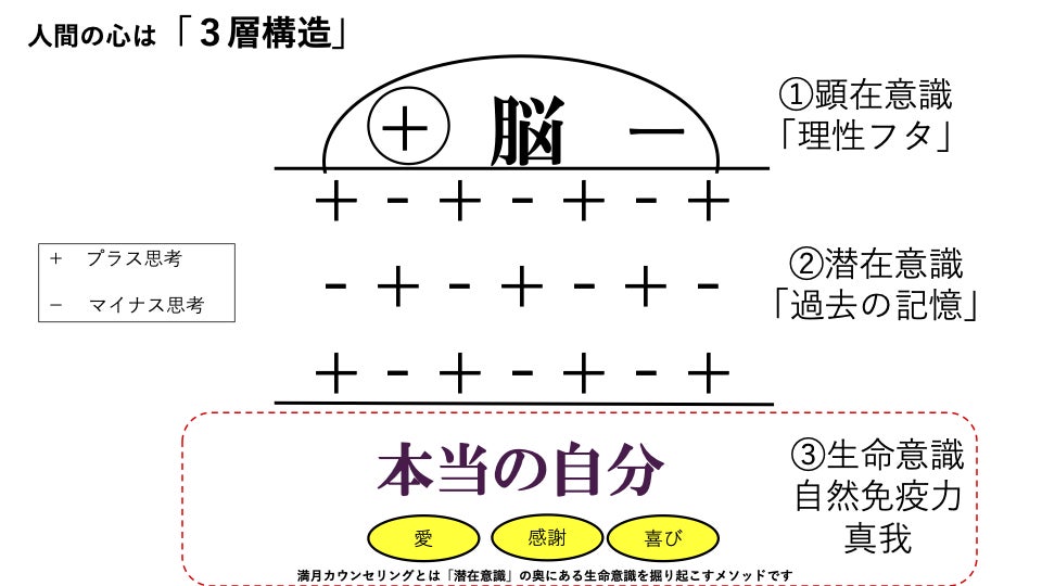 本カウンセリングのカギは、第3の心である「本当の自分(真我)・生命意識」に目覚めることです。