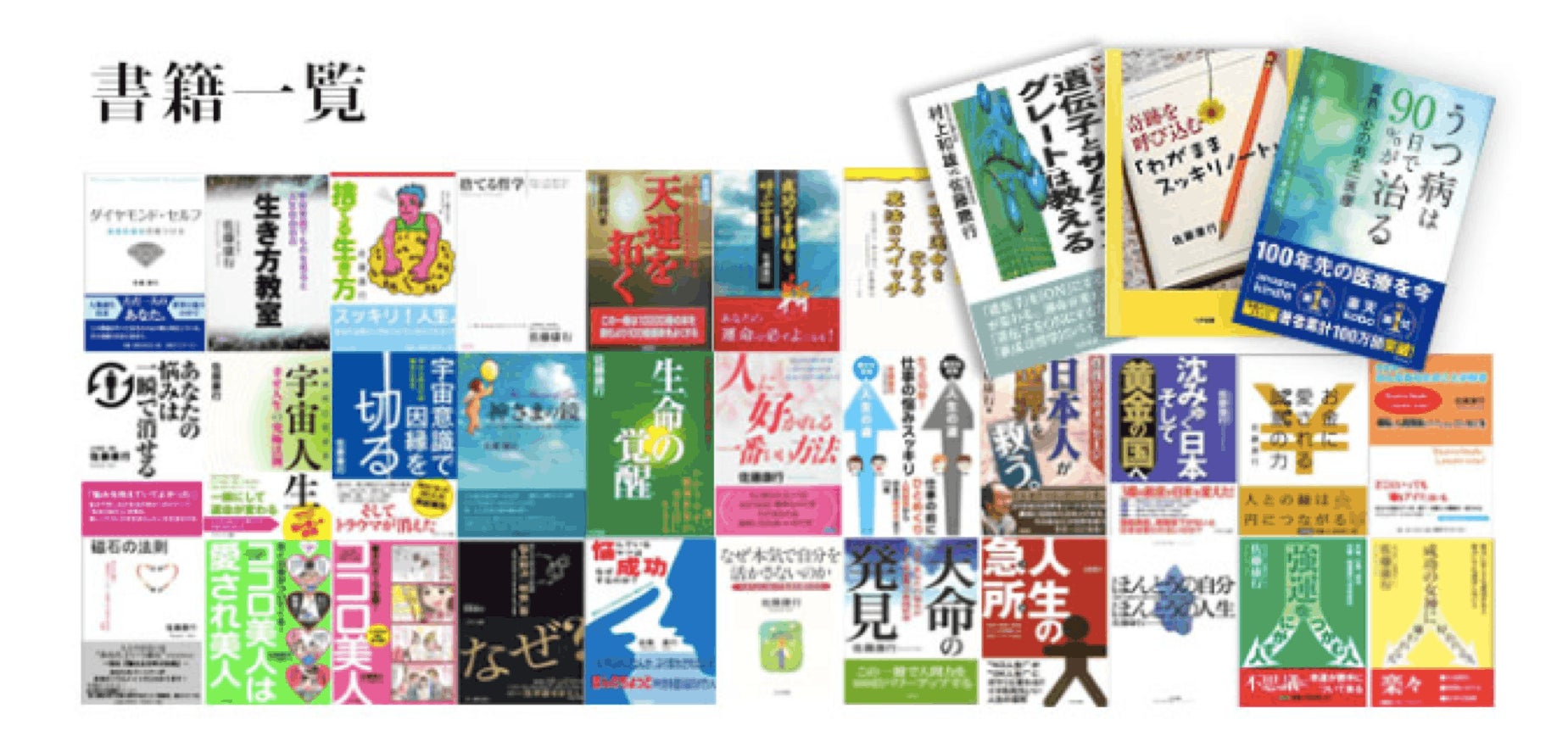 主な著書に、『満月の法則』(サンマーク出版)、『仕事で心が折れそうになったら読む本』(PHP研究所)、『過去は自由に変えられる』(産経新聞出版)、『お金の不安が消える本』(KADOKAWA)、『ダイヤモンド・セルフ』(アイジーエー出版)、『真我』100巻大全集(アイジーエー出版)、『がんを消す心の自然治癒力』(アイジーエー出版/ がん専門医 帯津良一氏との共著)、『しんどい月曜の朝がラクになる本」(サンマーク出版)などがある。
