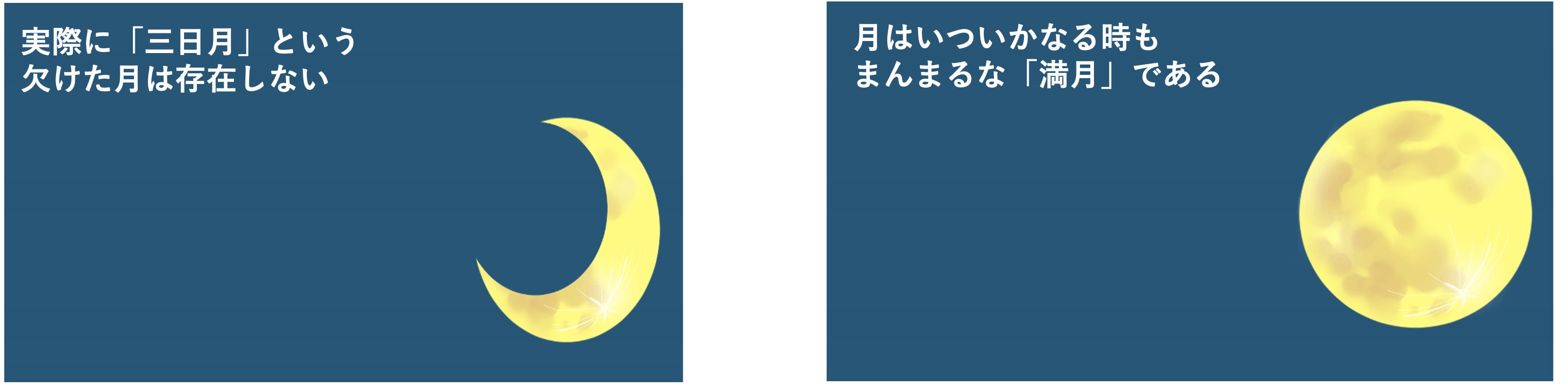 人は、一般的に過去の記憶や認識・情報から、「自分は〇〇な人間」「あの人は〇〇な人間→好き・嫌い」と判断しがちです。(三日月=過去の記憶や潜在意識で捉えている自分)