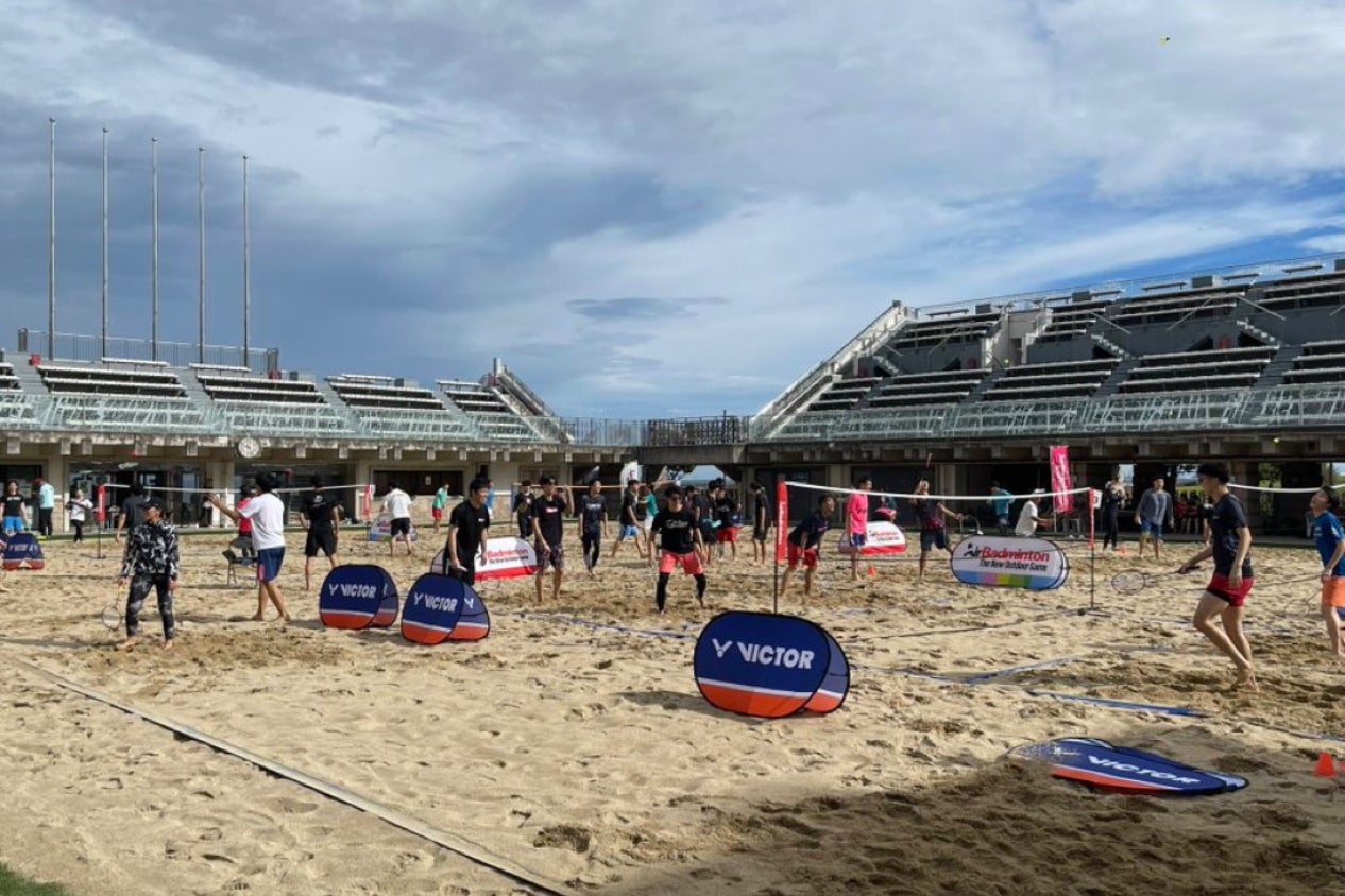 エアバドミントンは、屋外の砂浜の上でバドミントンを行うスポーツです。広い芝生のある公園やビーチ・グラウンドでも行うことができるスポーツなのでとても親しみやすいです!!
