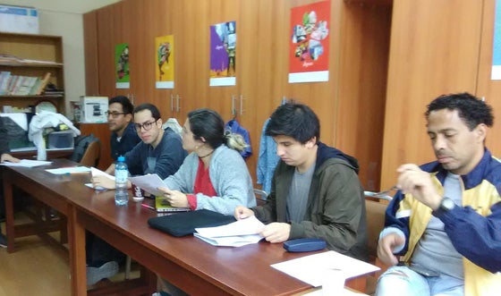 みんな監督の前で緊張しながら、台本合わせを行っています。セリフも日本語やスペイン語で練習しています。