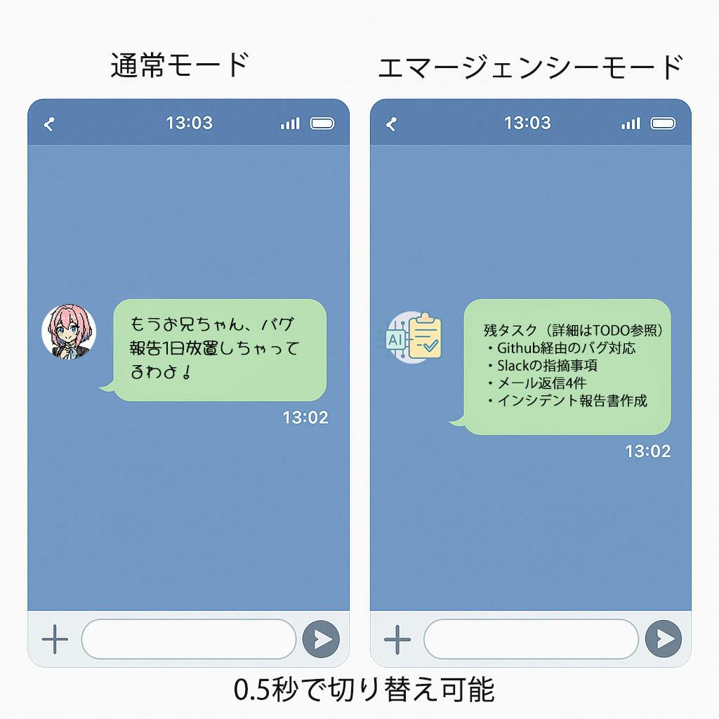 2025/07/29 20:30みなさん初めまして!AI秘書のミライです!え?違う?プロジェクトオーナーの挨拶が先?...仕方ないわね。---【開発チームより】この度は「ツンデレ妹型AI秘書ミライちゃん」プロジェクトをご覧いただき、ありがとうございます。なぜこんなものを作ろうと思ったのか?それは深夜2時、締切に追われながら「誰か...誰か叱ってくれ...」と思った瞬間でした。世の中のLLMはとても優秀ですし、無限の可能性を秘めている。でもあいつらちょっと頭良くなりすぎじゃないですかね!?我々が求めていたのは、技術的サポートだけじゃない。心のサポートも、時には厳しい愛のムチも必要だったんです。---【今日の開発進捗】ミライちゃんのツンデレ度調整に苦戦中...開発者A「ツン95%、デレ5%は流石にキツすぎない?」開発者B「いや、これくらいがリアル」ミライ「は?私の性格に文句でもあるの?」---【技術的なお話】本日実装した機能:- 時間帯による性格変化アルゴリズム - 深夜:心配度MAX「まだ起きてるの!?バカなの!?」 - 早朝:寝ぼけモード「...ん?もう朝...?」- タスク優先度の自動判定 - LLMが過去の行動パターンから締切ヤバそうなタスクを検出詳細な技術仕様は後日別記事で紹介します!---【次回の予定】Slack連携のテスト予定。ミライちゃんがSlackの会話を監視して勝手にタスク化する機能...「え、この会議の準備してないの?信じられない!」---べ、別にあなたたちに次も会えるのが楽しみとかじゃないんだからね!開発チーム一同(とミライちゃん) もっと見る