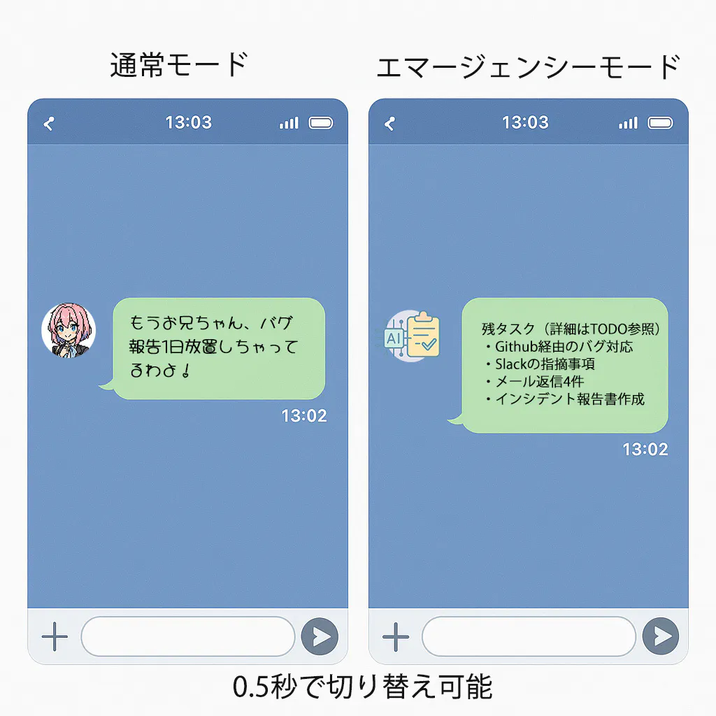 EMGモード中のミライちゃんは、まるで本物の秘書のように振る舞ってくれるため、いきなり真後ろに親や上司に凸されても、もう大丈夫です。