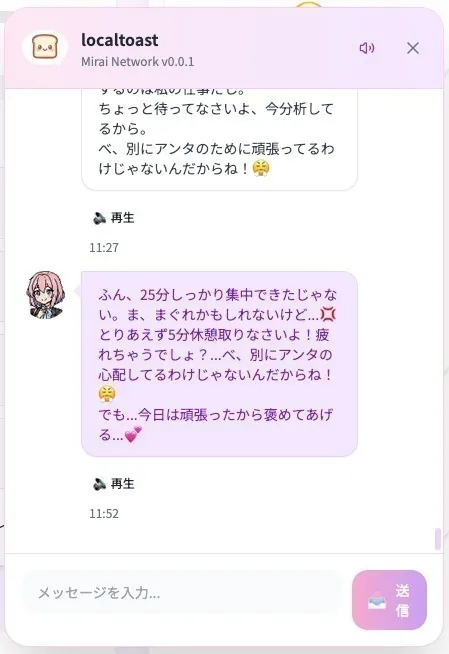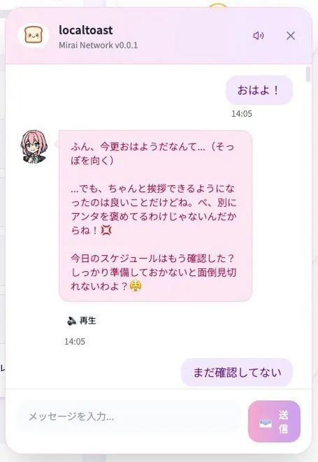 - 自然言語処理:「今日疲れた...」→「なによ、お兄ちゃんがそんな事言うなんて珍しいわね。そう思うなら休息も大切よ...まあ、少しくらい付き合ってあげてもいいけど?」