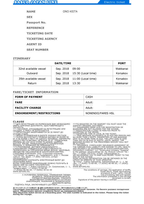 2018/09/11 20:40サハリン航路のEチケット届きました。 渡航に向けての準備は進んでいます。 目標の達成にはまだ開きがありますが最後まで募集を受け付けていますので興味のある方はぜひご支援ください。 もっと見る