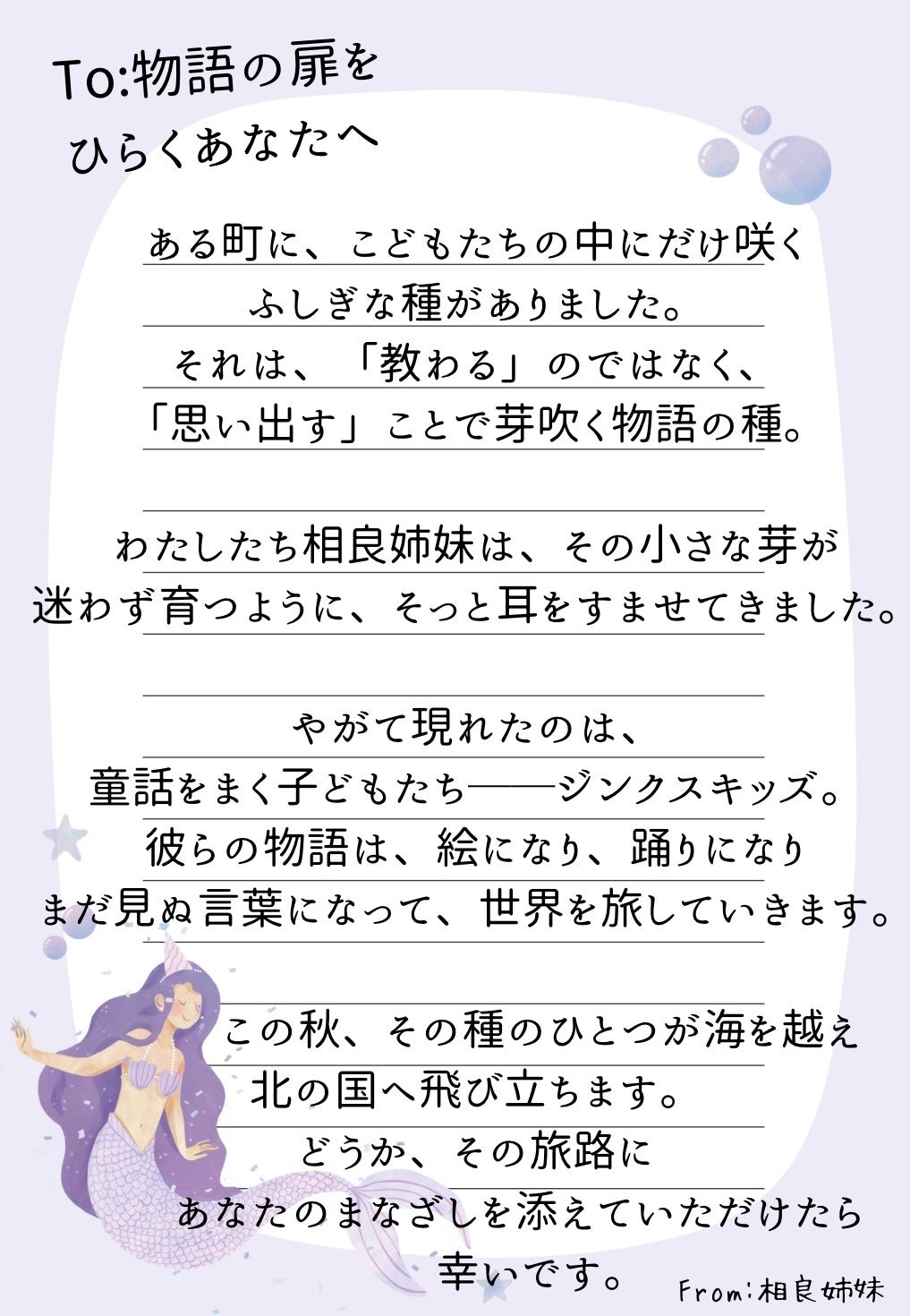 2025/11/29 10:30最初の100万円のご支援を本当にありがとうございました。この資金で私たちはデンマークへ渡り、国の文化機関・教育機関と正式に童話外交の協働が始動しました。✴︎子どもたちとフェアリーテイリングWSを開催✴︎自閉症の子どもも参加し、感性が開き物語を紡いだ✴︎国家機関から「継続的に連携したい」と正式パートーナー提携✴︎デンマークの教育の現場で導入したいという提案✴︎童話外交が“国際プロジェクト”として動き始めたこの100万円は「希望」ではなく、確かな結果 を残すことができました。そして今、その流れを「日本」に還元するため、ストレッチゴール150万円を設定しています。◆次の挑戦は、まずは12月14日“童話の里”玖珠町、そして"人魚伝説"の宮古島〜なりやまあやぐ祭り〜が来年秋に向けて動き出しました。日本各地で、フェアリーテイリングを広げること。子どもたちの声が社会を動かす瞬間を各地でつくること。世界が動き出した今、“日本発の童話外交”を本格的に根づかせるためにストレッチゴールを設定しました!\とうとう、クラファンは 明日が最終日 です/もしこの挑戦に心が動いた方がいたら、最後の一歩をどうかお力添えいただけたら嬉しいです。私たち姉妹と子どもたちだけでは到底ここまで来られませんでした。最後の一歩を、一緒に未来へ。相良姉妹 もっと見る