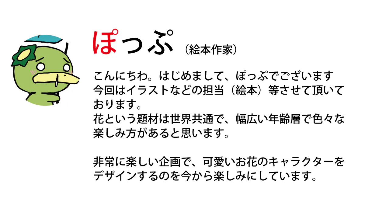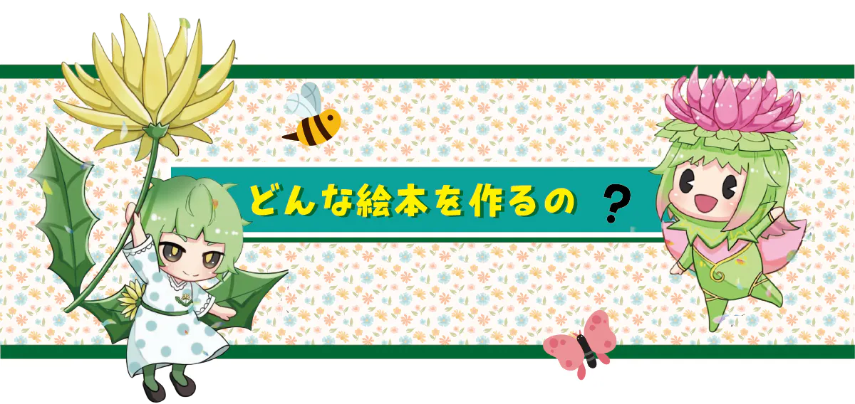 私たちの幼少時代に比べ、現代の子供たちは花と触れ合うきっかけが少なくなってきました。デジタル機器の普及・地球温暖化・都市開発の拡大など様々な要因がありますが、今後この流れを止めることはできないと感じています。私たちはこの絵本を通して子供たちが花に興味を持ち、自然を大切に思う心を育てるきっかけになってほしいと考えてます。
