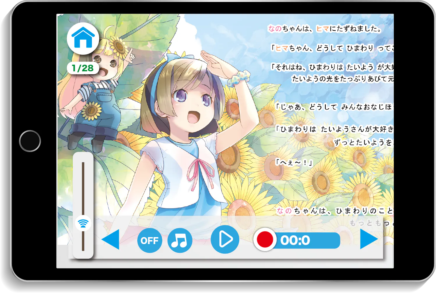 ひらがなが読めるようになってくると朗読がなくても子供たちは絵本を自ら読んで楽しむことができます。専用のアプリには録音機能を付属しており、お子様自ら朗読した音声を録音して保存することができます。上手に朗読できたらたくさん褒めてあげてください。