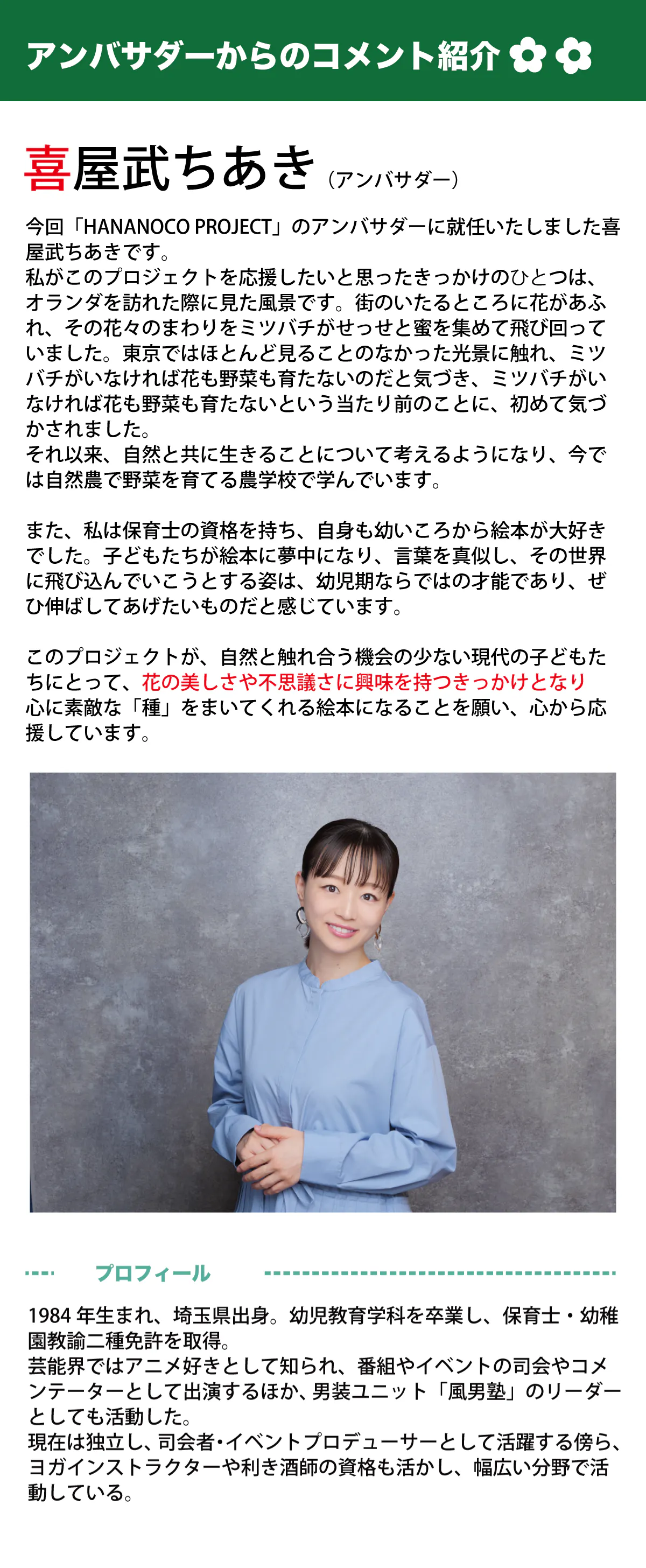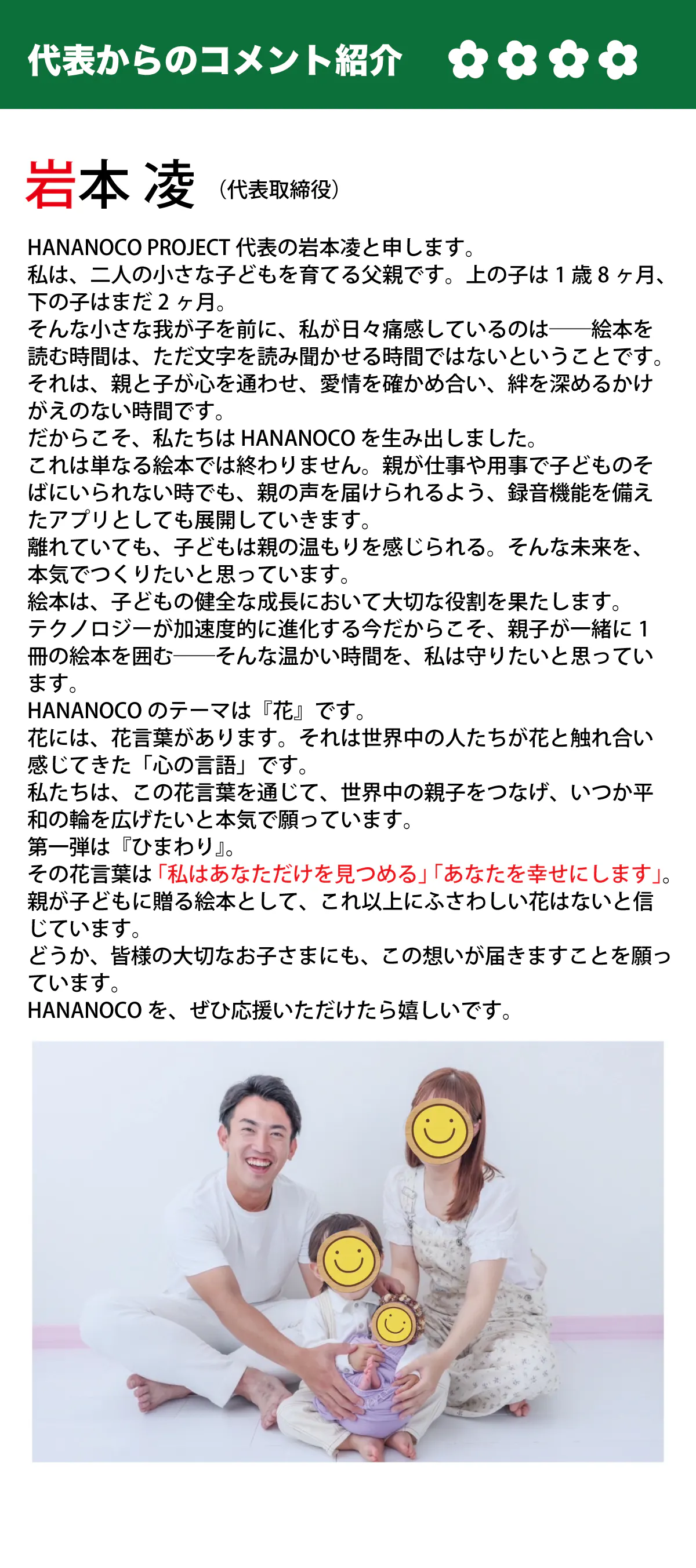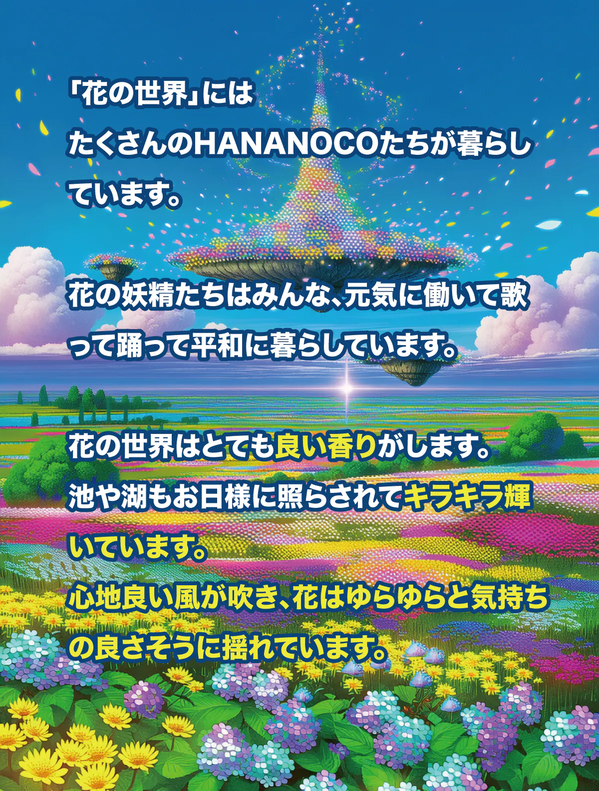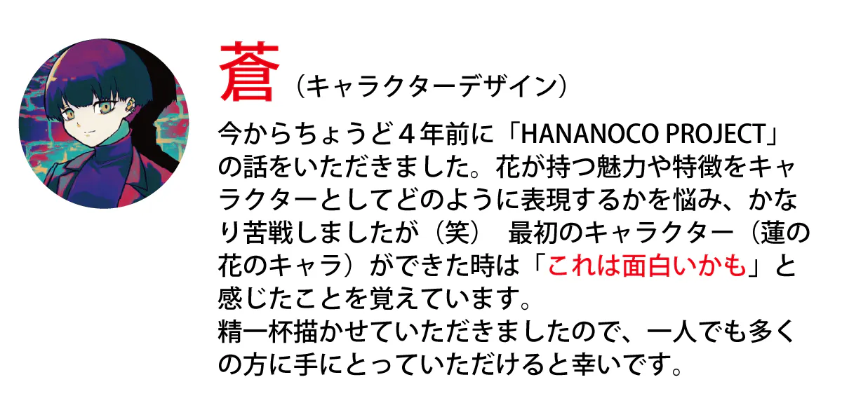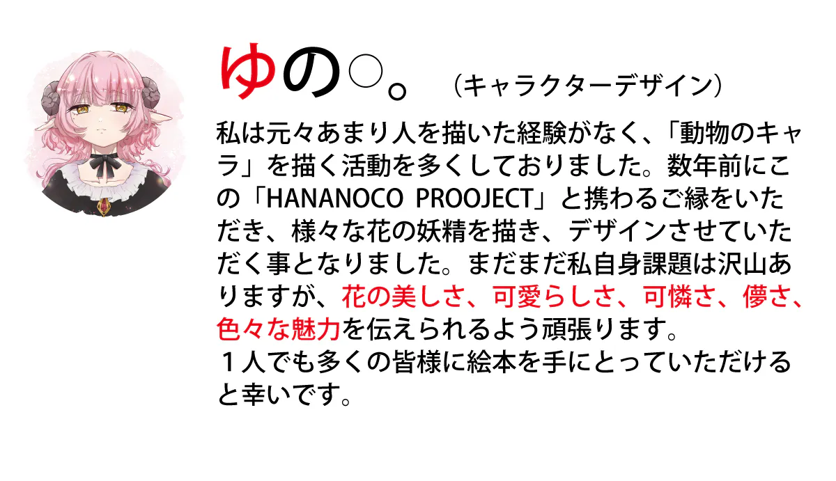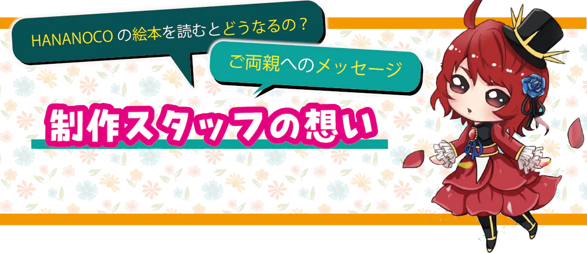 また「HANANOCO(花の妖精)」という現実にはいるはずのない存在を通じて、子供たちが「目に見えない存在」を感じたり、自分だけの物語を心に描けるようになる。「この花にも妖精がいるかもしれない」と想像することで、想像力豊かに成長することを願います。