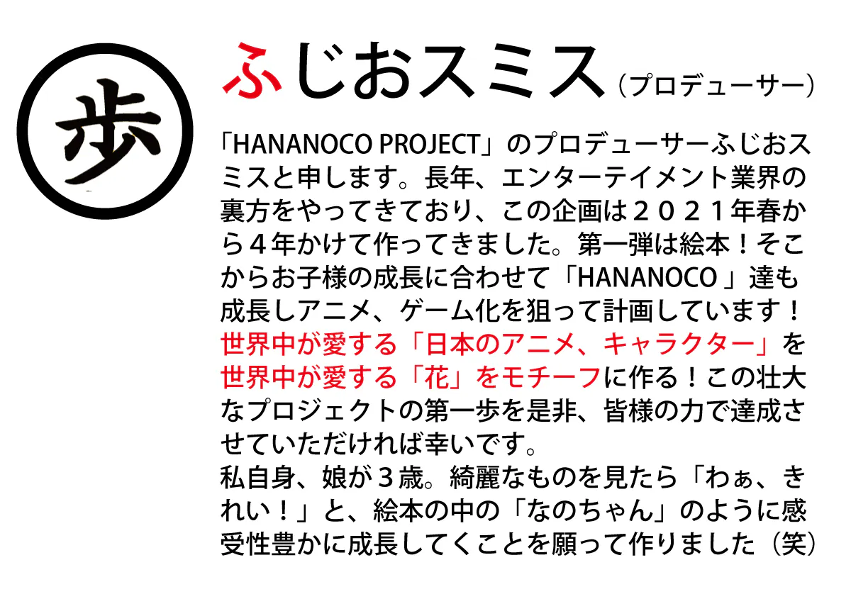 花に触れ合う機会が減っている現代。世界中の子供たちが絵本を通して、「花の美しさ・大切さ」に気づき、子供たちの「感受性の成長」に貢献できれば幸いです。