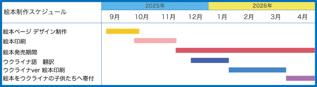 上記のスケジュールのように2025年12月から1月の売上を計算しその売上の10%を活用し2026年4月にウクライナの子供たちへ絵本を寄贈させていただきます。