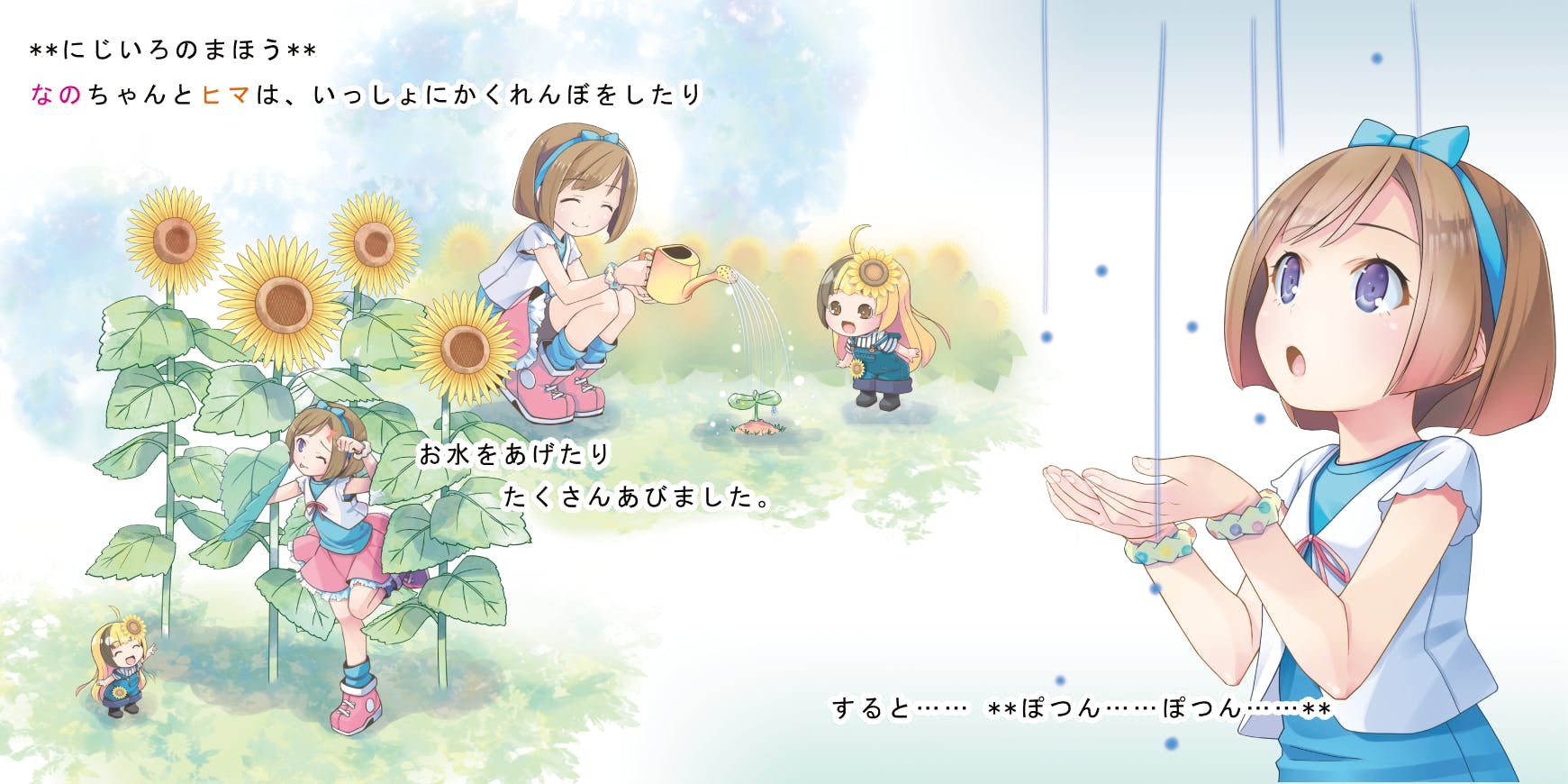 なのちゃんとひまちゃんは、一緒に かくれんぼ をしたり、お花にお水をあげたり、たくさん遊びました。