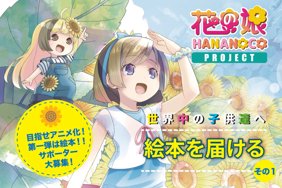 『HANANOCO PROJECT』の第1弾が絵本。向日葵(ひまわり)の妖精「ひま」と人間の女の子「なのちゃん」のお話を絵本にしたい!そんなクラウドファンディングプロジェクトになります。