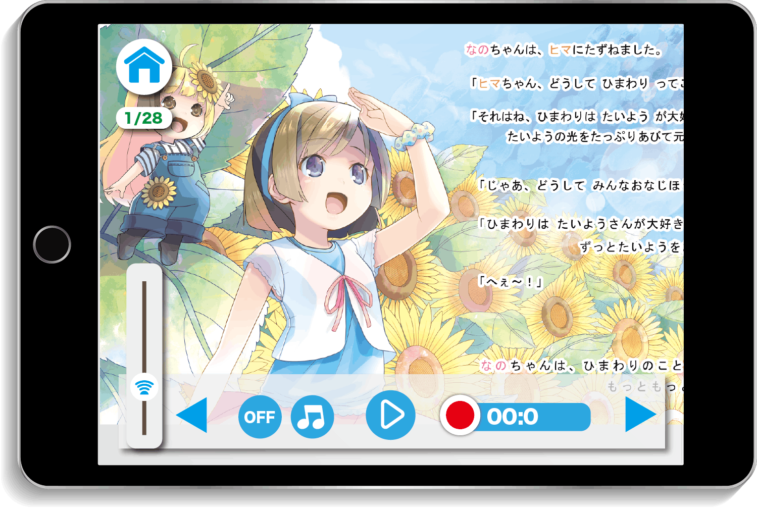 ひらがなが読めるようになってくると朗読がなくても子供たちは絵本を自ら読んで楽しむことができます。専用のアプリには録音機能を付属しており、お子様自ら朗読した音声を録音して保存することができます。上手に朗読できたらたくさん褒めてあげてください。
