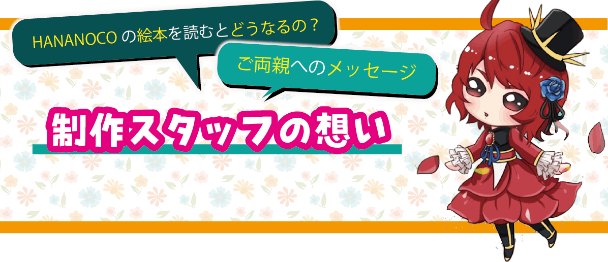 また「HANANOCO(花の妖精)」という現実にはいるはずのない存在を通じて、子供たちが「目に見えない存在」を感じたり、自分だけの物語を心に描けるようになる。「この花にも妖精がいるかもしれない」と想像することで、想像力豊かに成長することを願います。