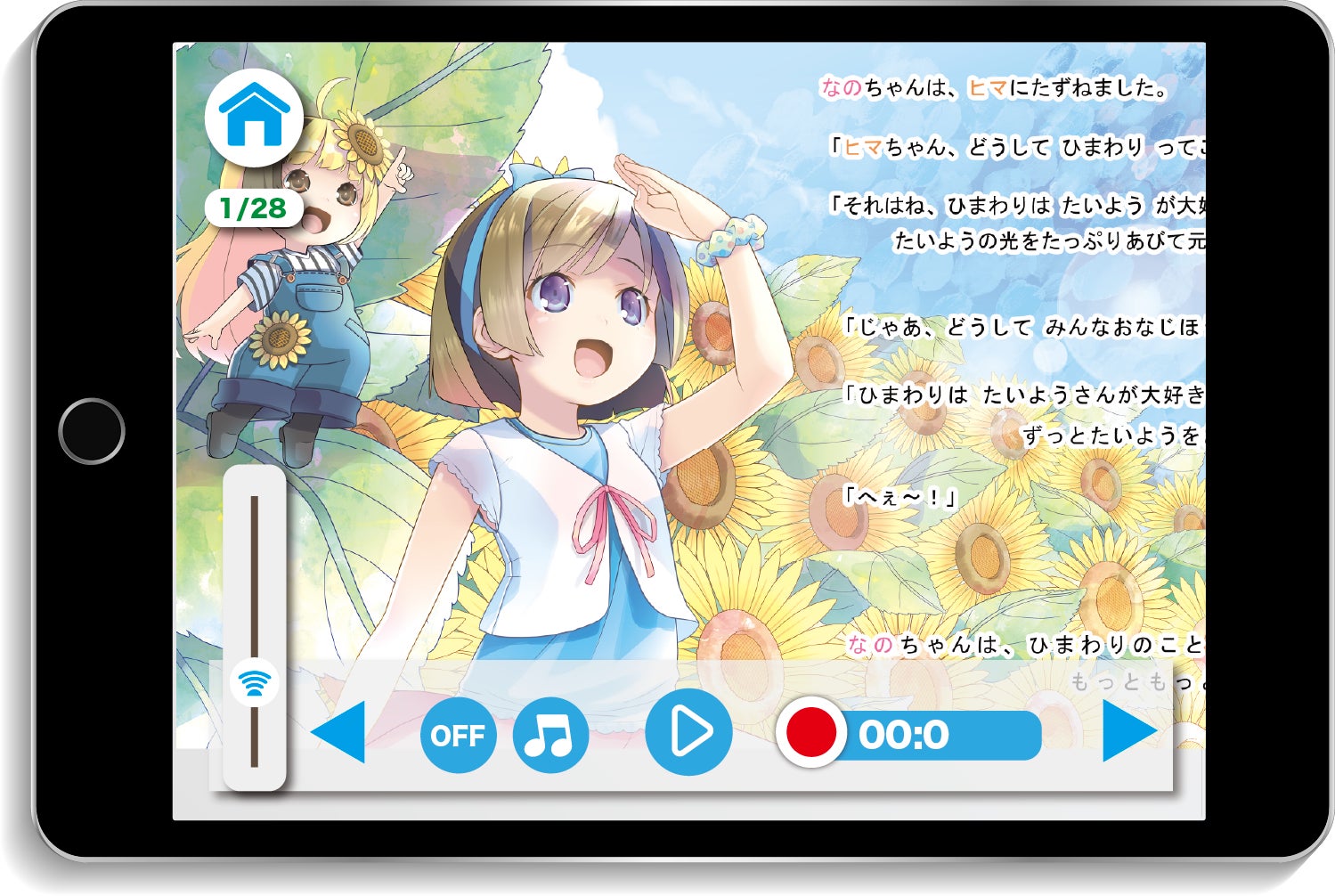 ひらがなが読めるようになってくると朗読がなくても子供たちは絵本を自ら読んで楽しむことができます。専用のアプリには録音機能を付属しており、お子様自ら朗読した音声を録音して保存することができます。上手に朗読できたらたくさん褒めてあげてください。