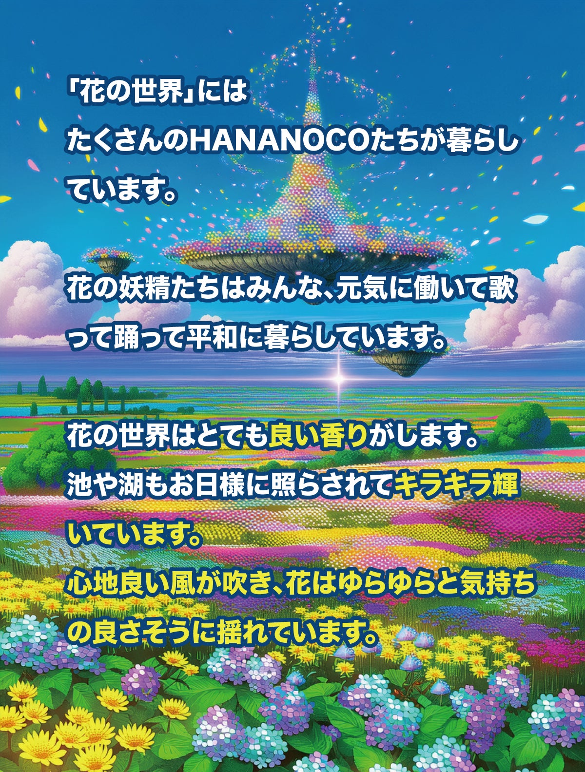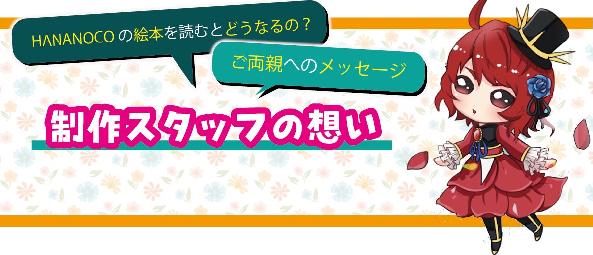 また「HANANOCO(花の妖精)」という現実にはいるはずのない存在を通じて、子供たちが「目に見えない存在」を感じたり、自分だけの物語を心に描けるようになる。「この花にも妖精がいるかもしれない」と想像することで、想像力豊かに成長することを願います。