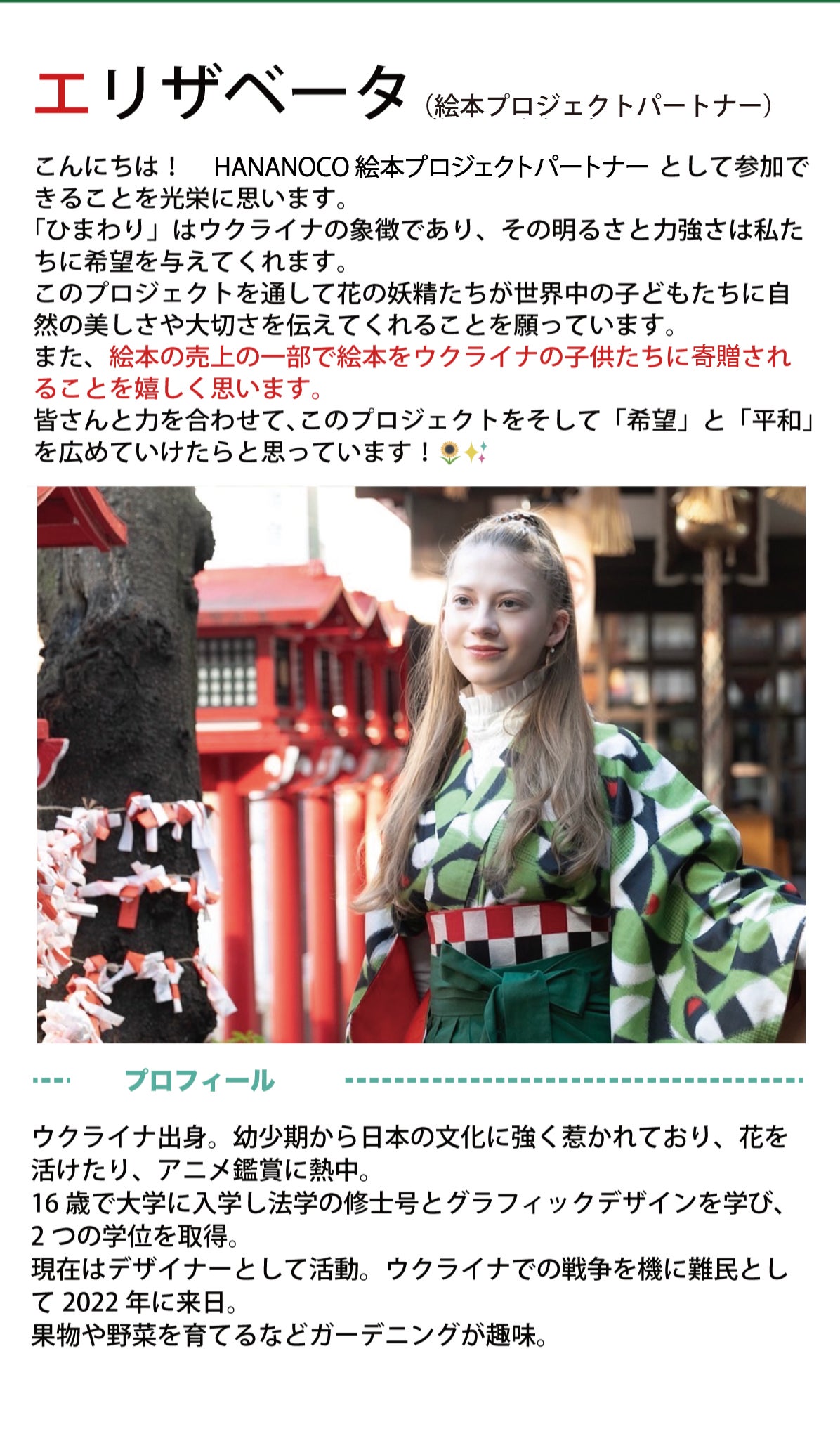 私たちの想いに賛同していただき、絵本プロジェクトパートナーに就任したウクライナ人のエリザベータさんの動画をご覧ください。「ひまわり」はウクライナの国花です。