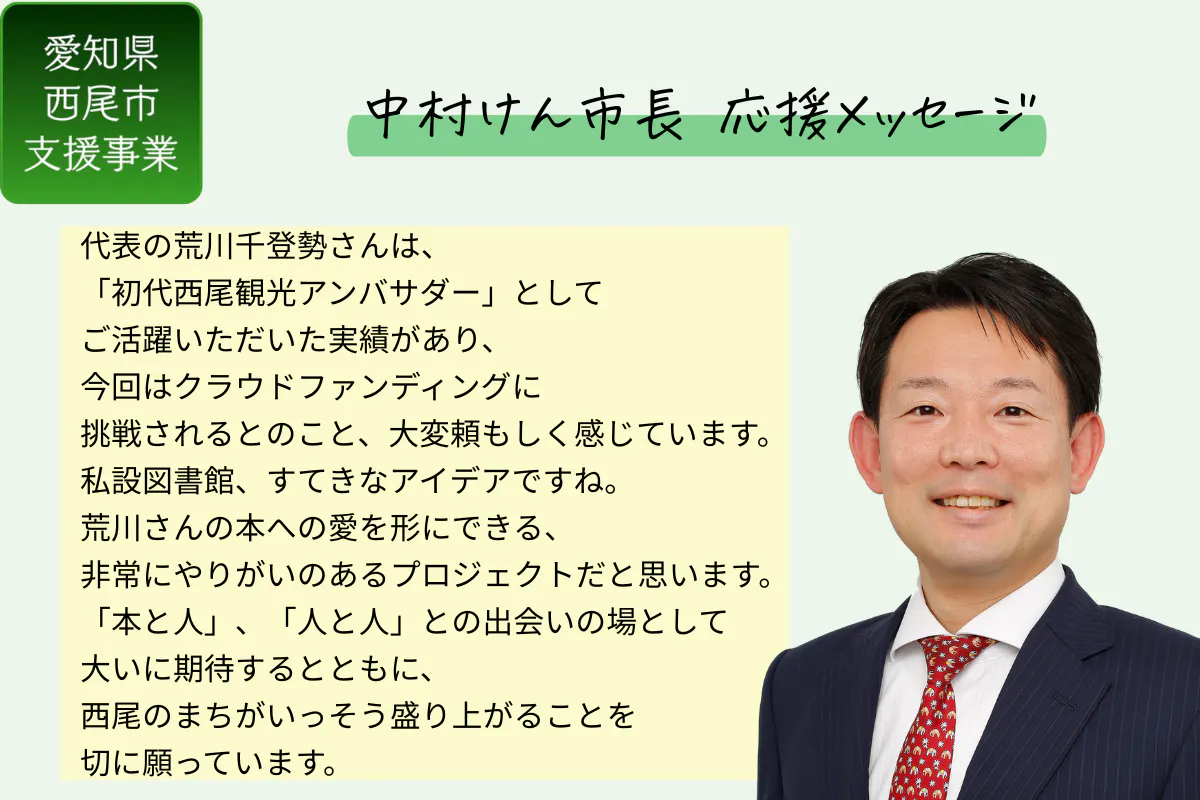 「オチャノマ文庫」は、西尾の皆さまはもちろん、西尾市外の方でも「本」が好きな方と一緒に作り上げていく私設図書館です。このプロジェクトを成功させるためには、皆さまからの温かいご支援とご協力が不可欠です。「オチャノマ文庫」が西尾のまちなかの新しい文化交流拠点となるよう、精一杯努めますので、どうぞ、ご支援をよろしくお願いいたします。