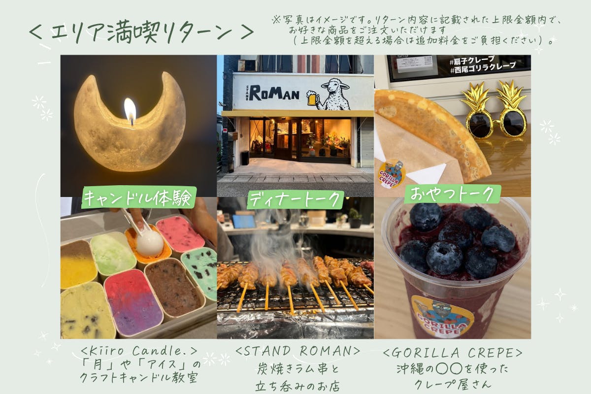 →オチャノマ文庫が入るテナントには、炭焼きラム串の<STAND ROMAN>さん、沖縄の◯◯を使ったクレープの<GORILLA CREPE>さん、クラフトキャンドルの<Kiiro Candle.>さんがいらっしゃいます。オチャノマ文庫をご覧いただいた後に、館長の私と一緒にそれぞれのお店を楽しむリターンもございます♪
