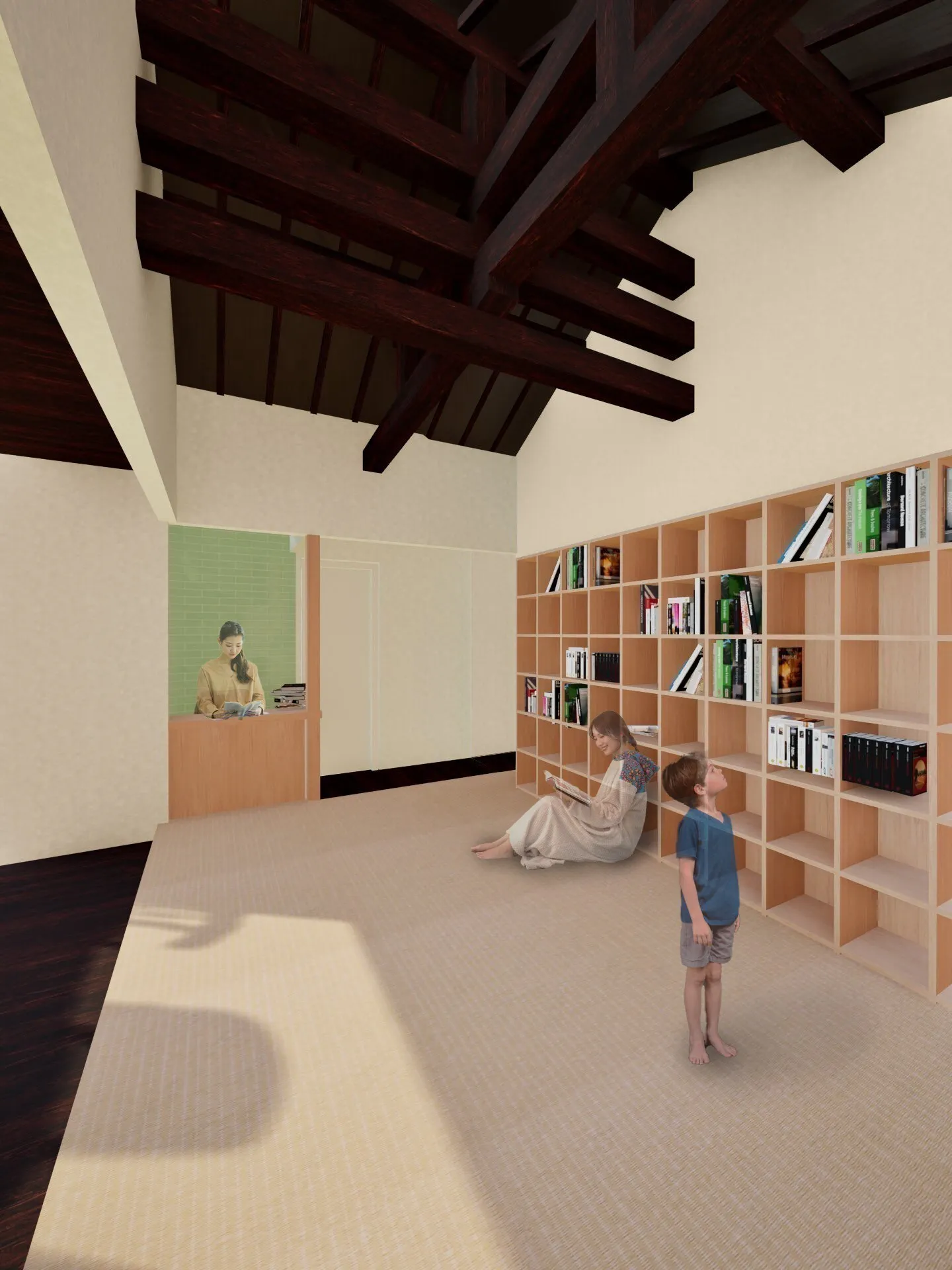 全国有数の抹茶の産地であり、寺社仏閣なども多い歴史ある「西尾」の雰囲気に調和するように、畳敷きの温かみある空間にし、訪れた方が心地よく過ごせる図書館を目指しています。