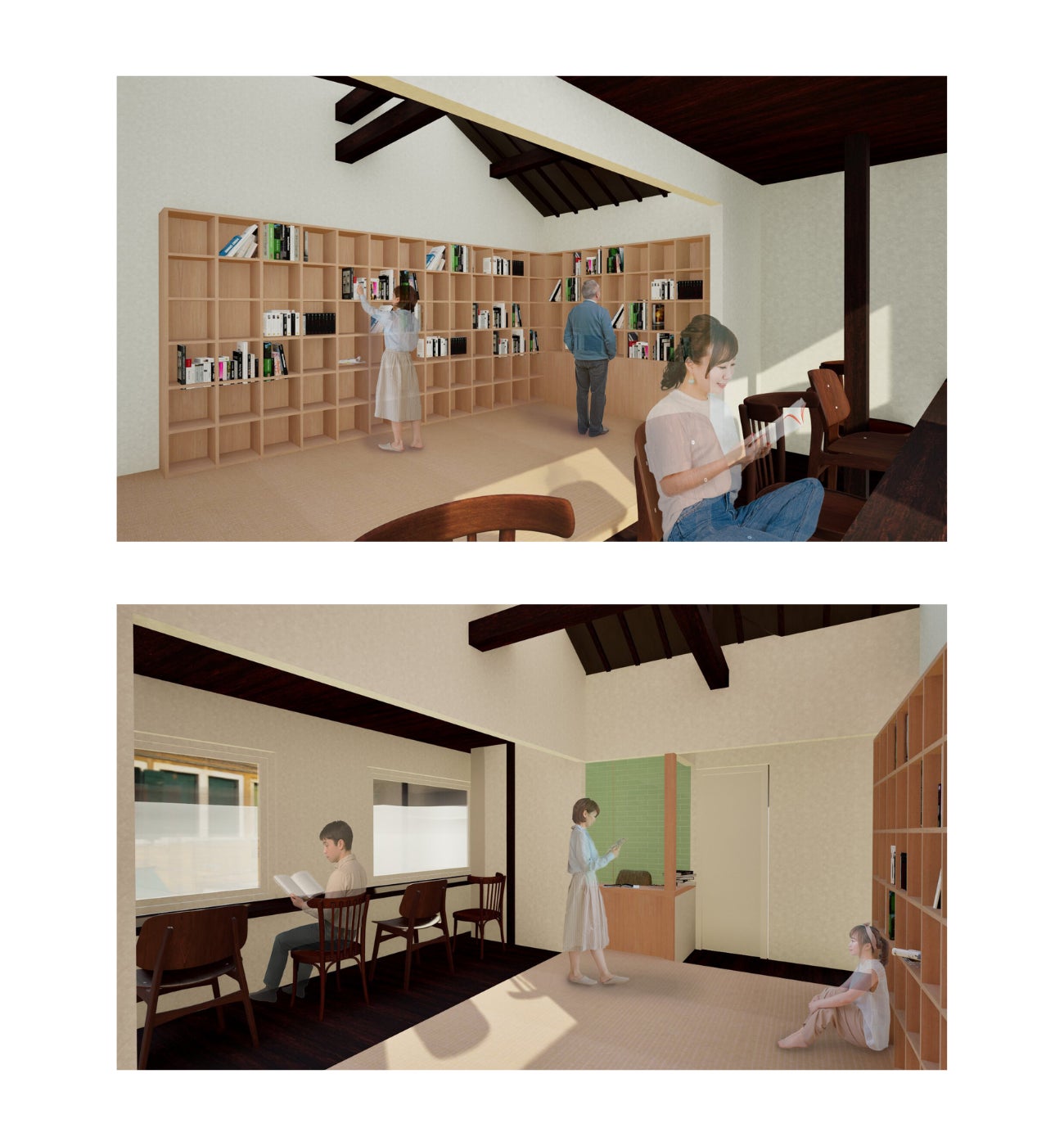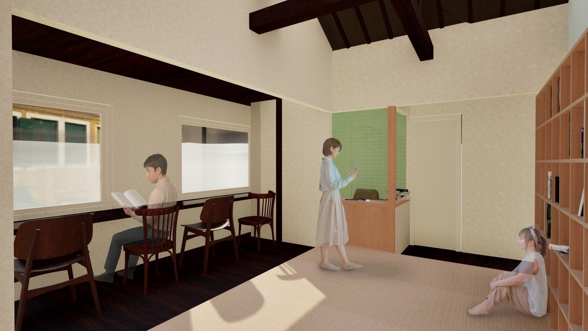全国有数の抹茶の産地であり、寺社仏閣なども多い歴史ある「西尾」の雰囲気に調和するように、畳敷きの温かみある空間にし、訪れた方が心地よく過ごせる図書館を目指しています。