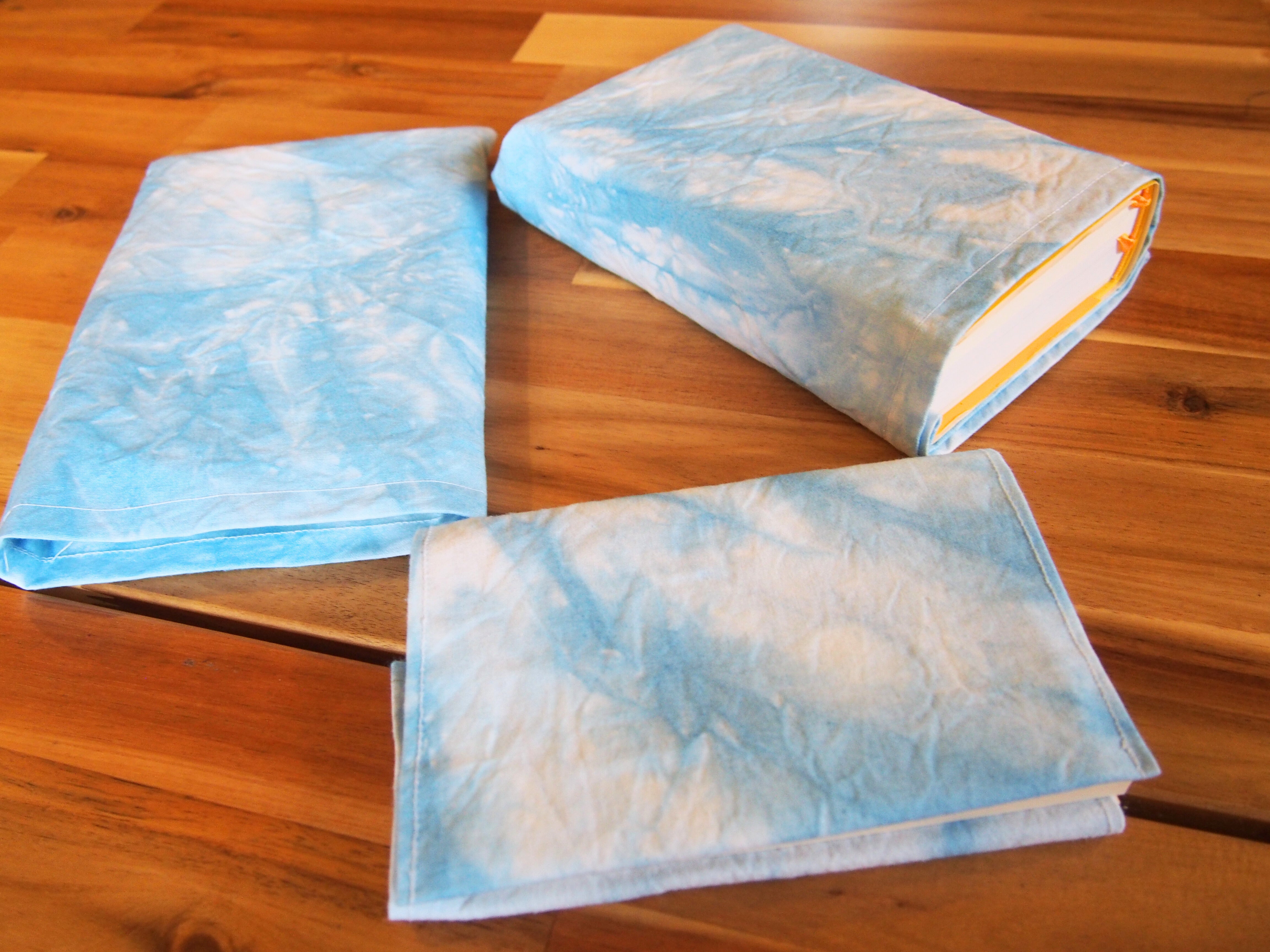 丈夫な白地の布に空をイメージした染色を施し、様々なサイズの本が入る袋などをミシンで作ってみました。(染め物や裁縫は初心者なので、祖母に教わっています。)