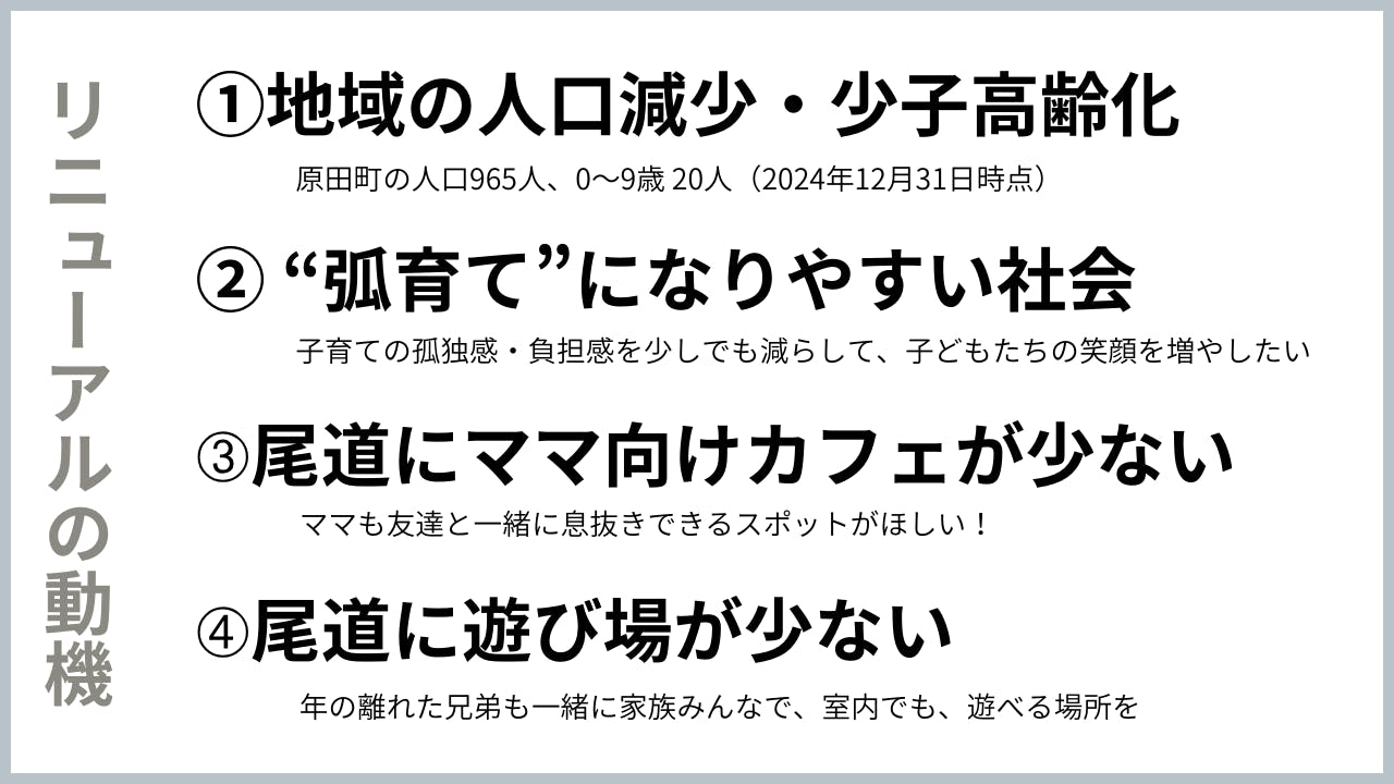 また、地域の目線から見ても、原田町内の子育て世帯は年々減少しています。 だからこそ近隣地域からも親子で訪れてもらえるような魅力的な場にして、やまそら全体があたたかい親子の笑顔でにぎわう景色を増やしていきたいと思っています。