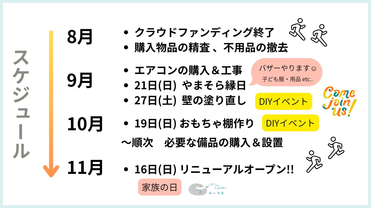 教室の壁を塗ったり、棚をつくってみたりする作業はイベントとして進める予定です。リターンにもなっているので、ぜひご参加をお待ちしています!イベント日以外でも、キッズルームの修繕をお手伝いしてくださるのは大歓迎ですので、どうぞよろしくお願いいたします。