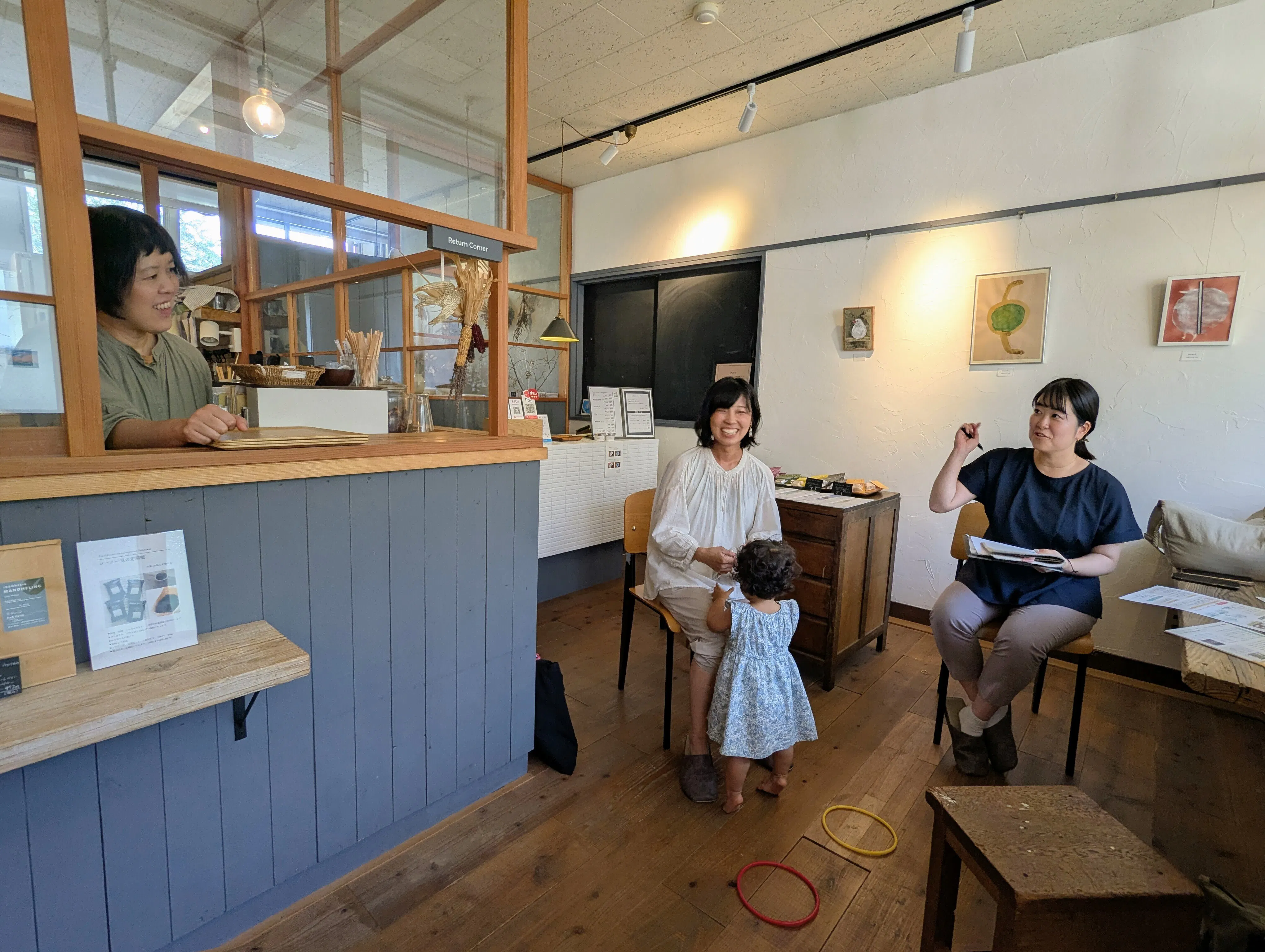 最初に2階にあるキッズルームを実際に見てもらってから、やまそら1階にあるPerch Cafeに移動してドリンクを飲みながらお話を聞いてもらいました。