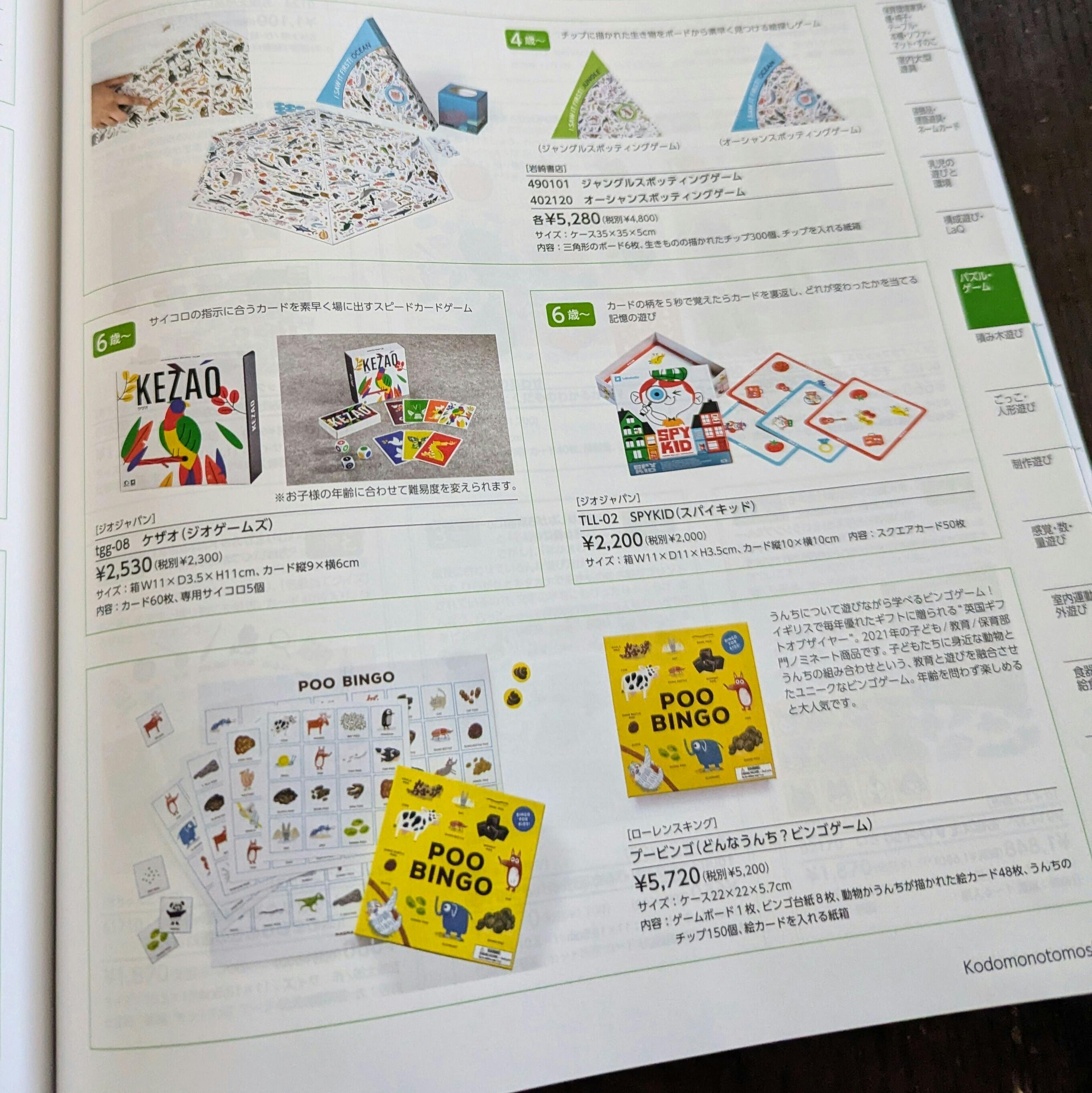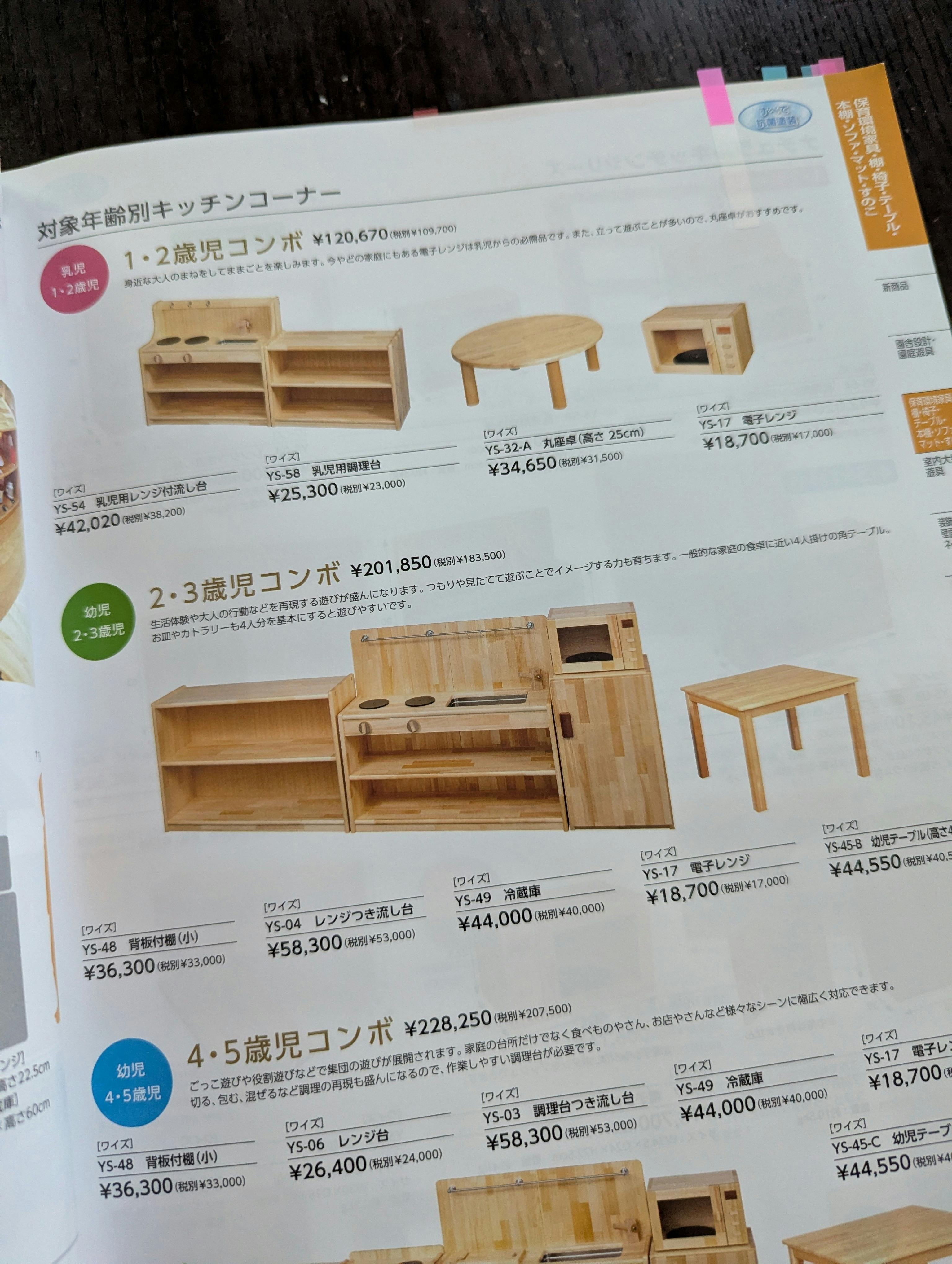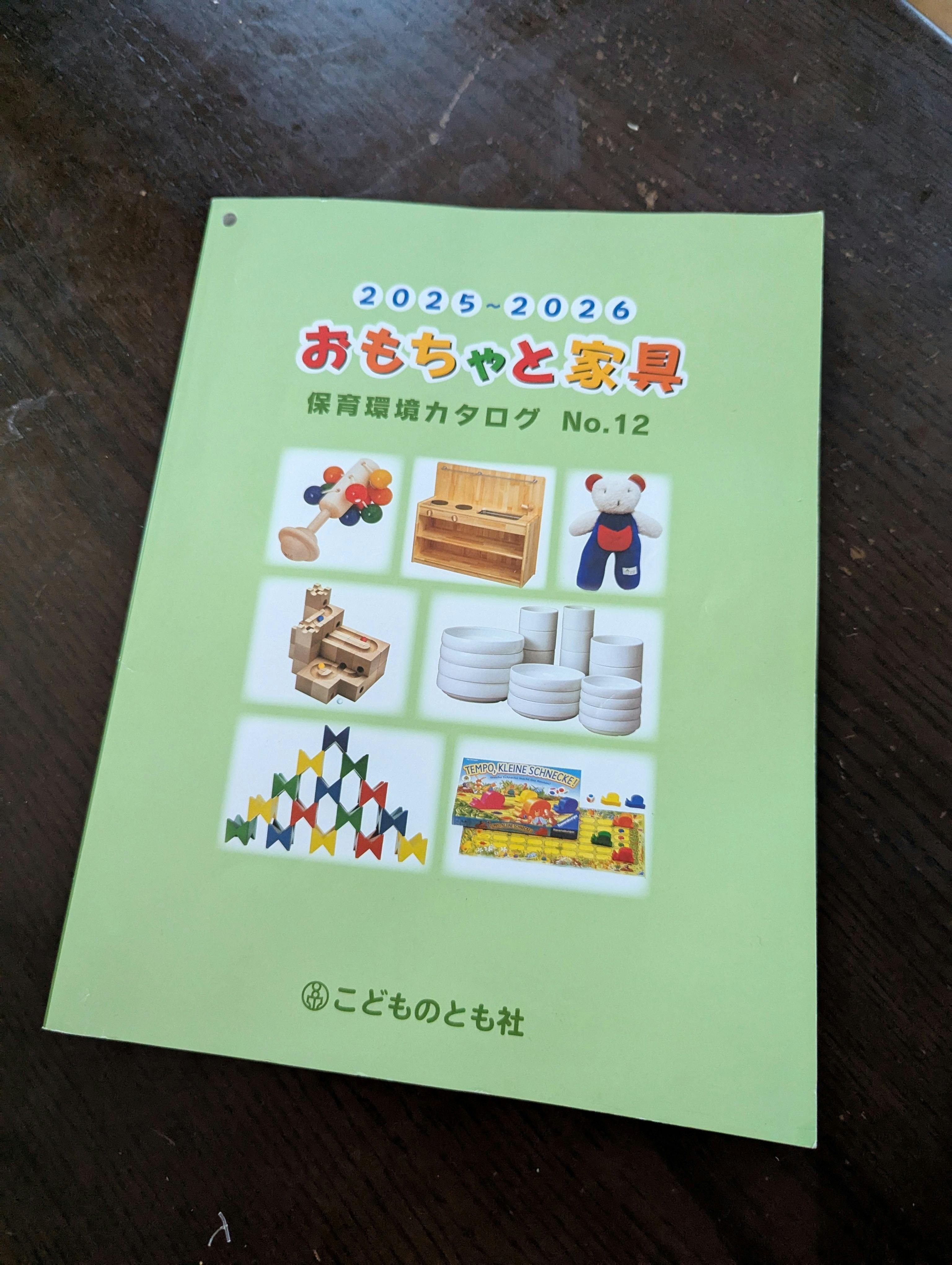 普段お店で見るラインナップとは全く違う、保育施設向けの玩具や家具がぎゅっと詰まったカタログで、眺めているだけでもワクワクします。
