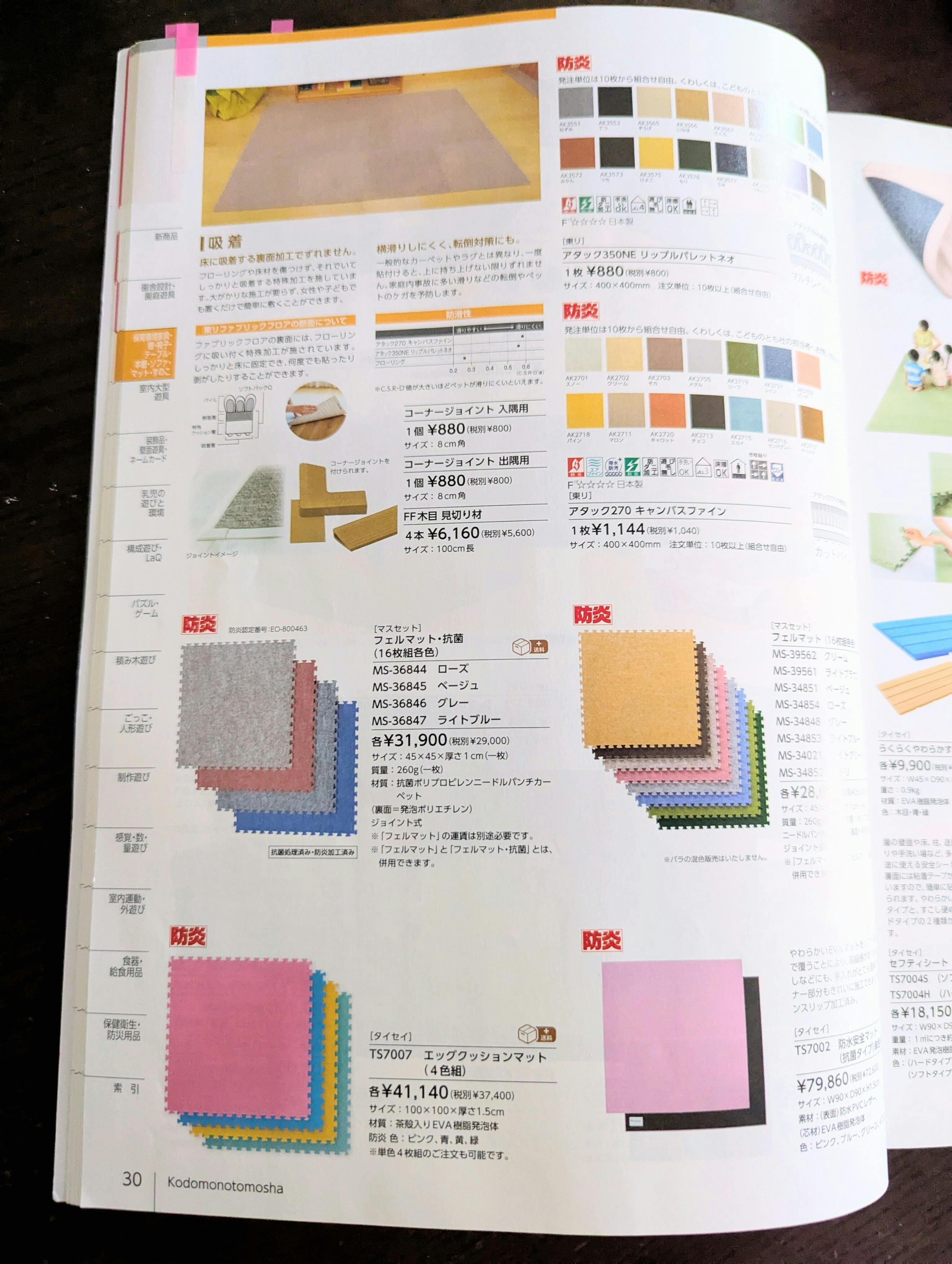 マットの情報もあります。できたら防炎のものが安心!広さと予算、考えますね。