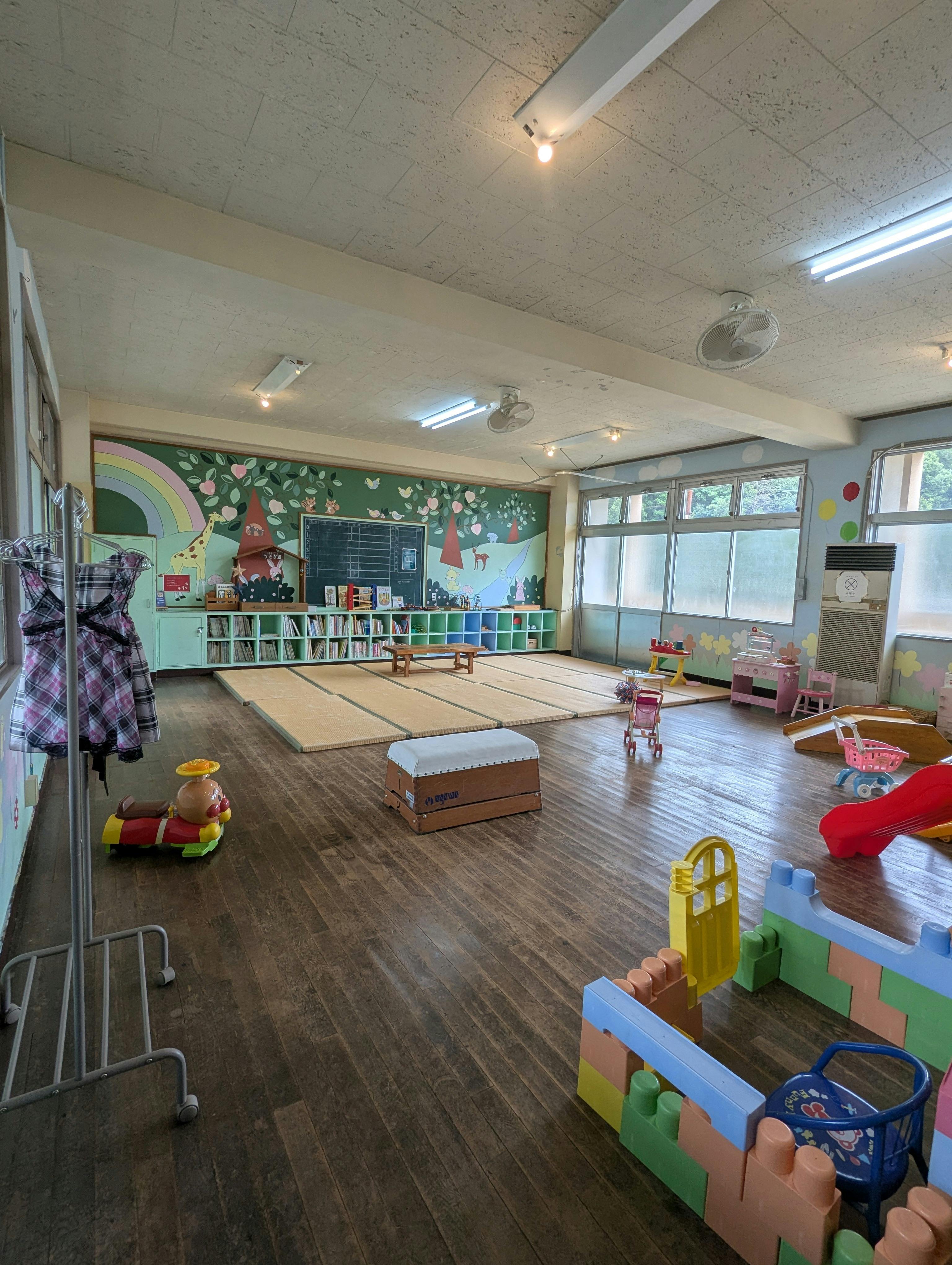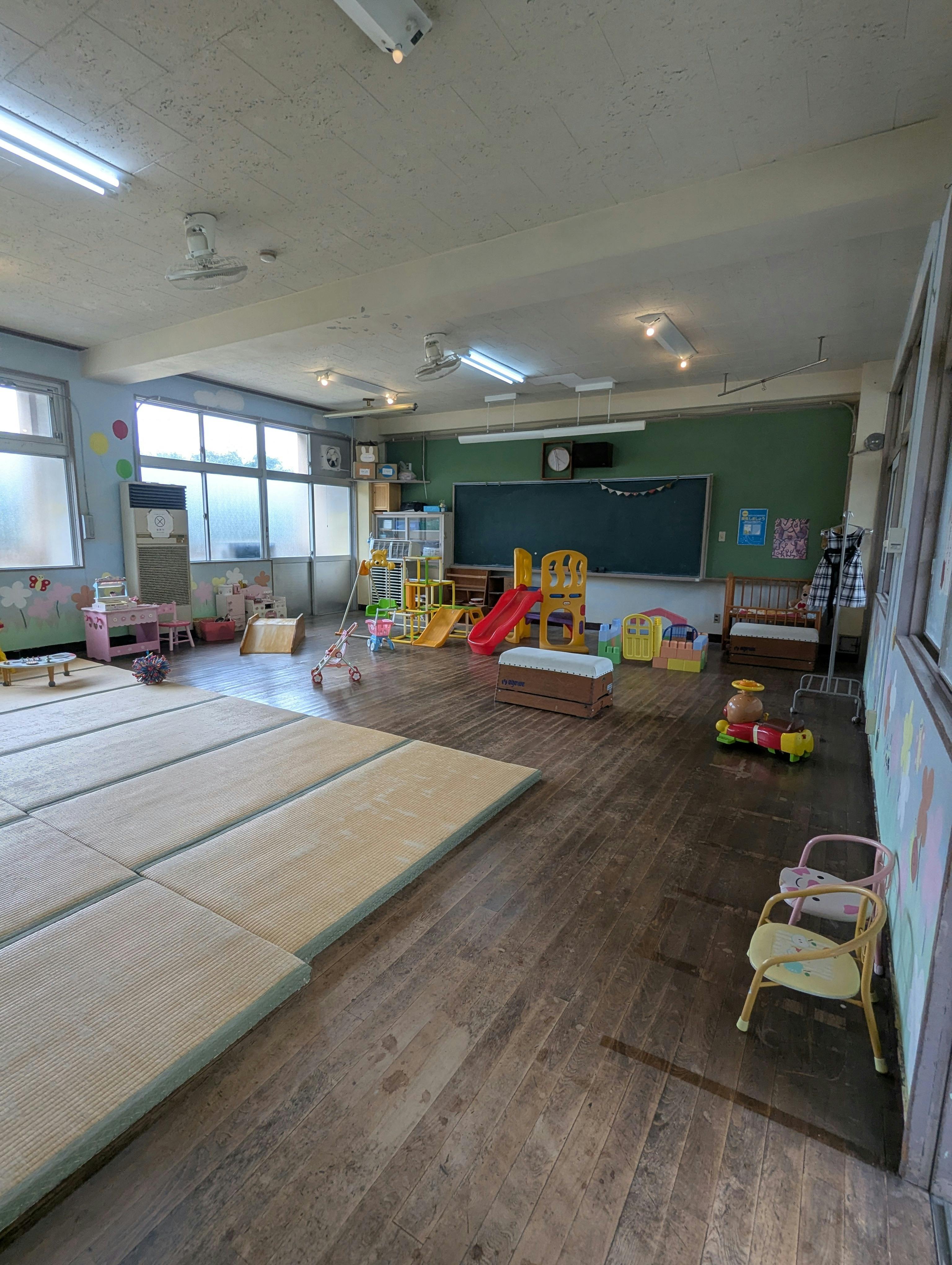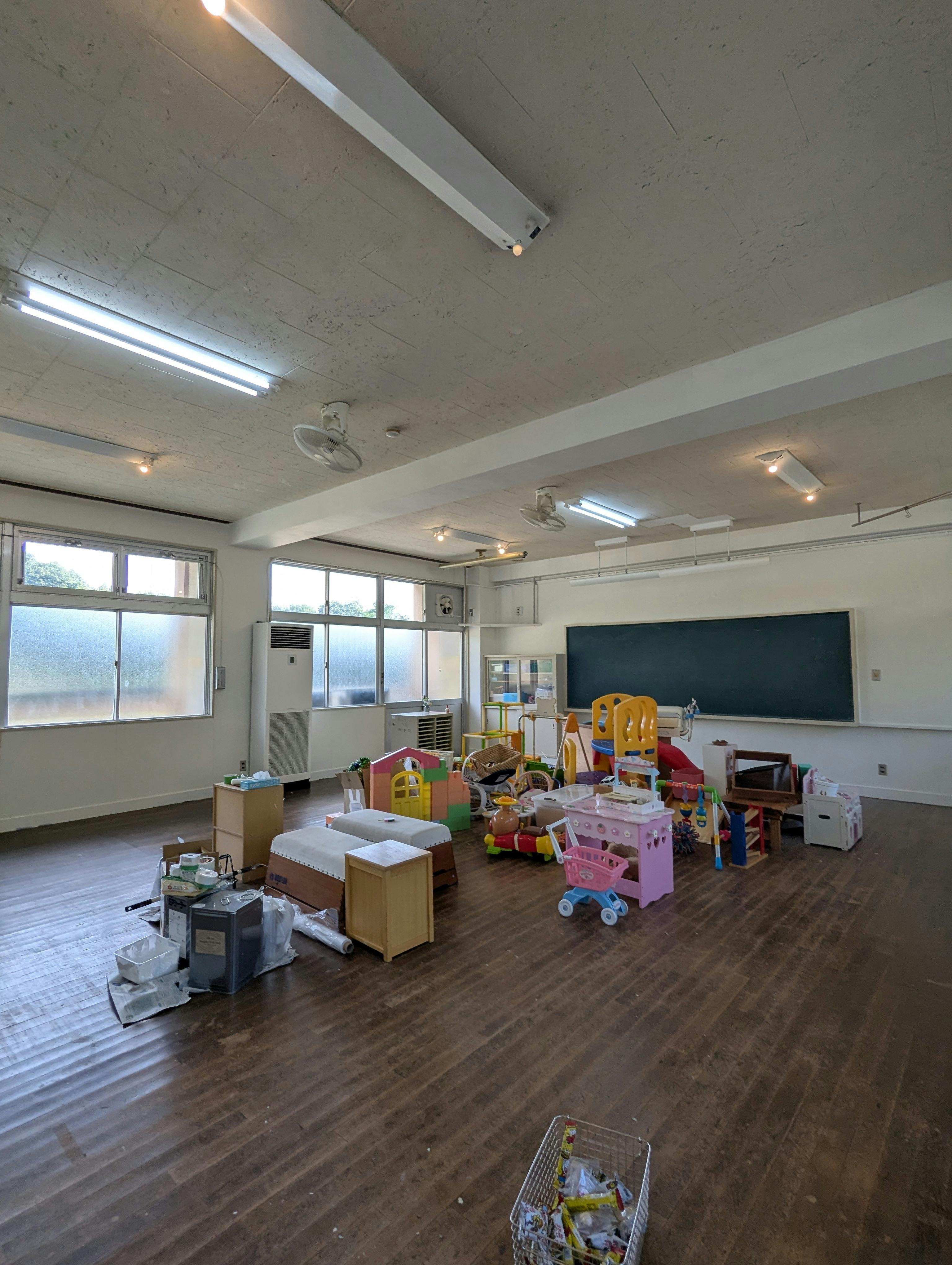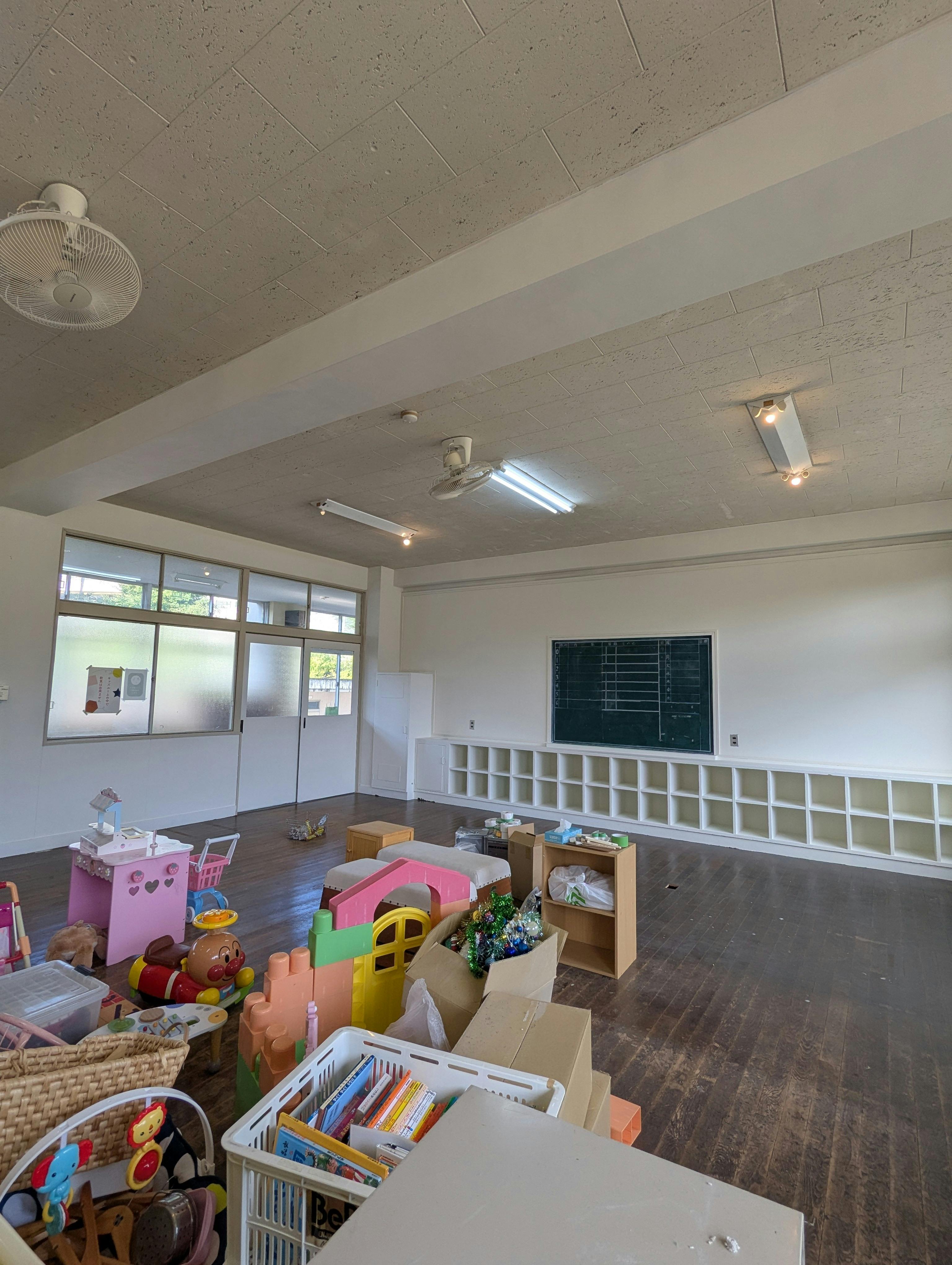もともとは全面にかわいいイラストが描かれていた教室でしたが、白と淡いベージュの2色使いに塗り替えました。