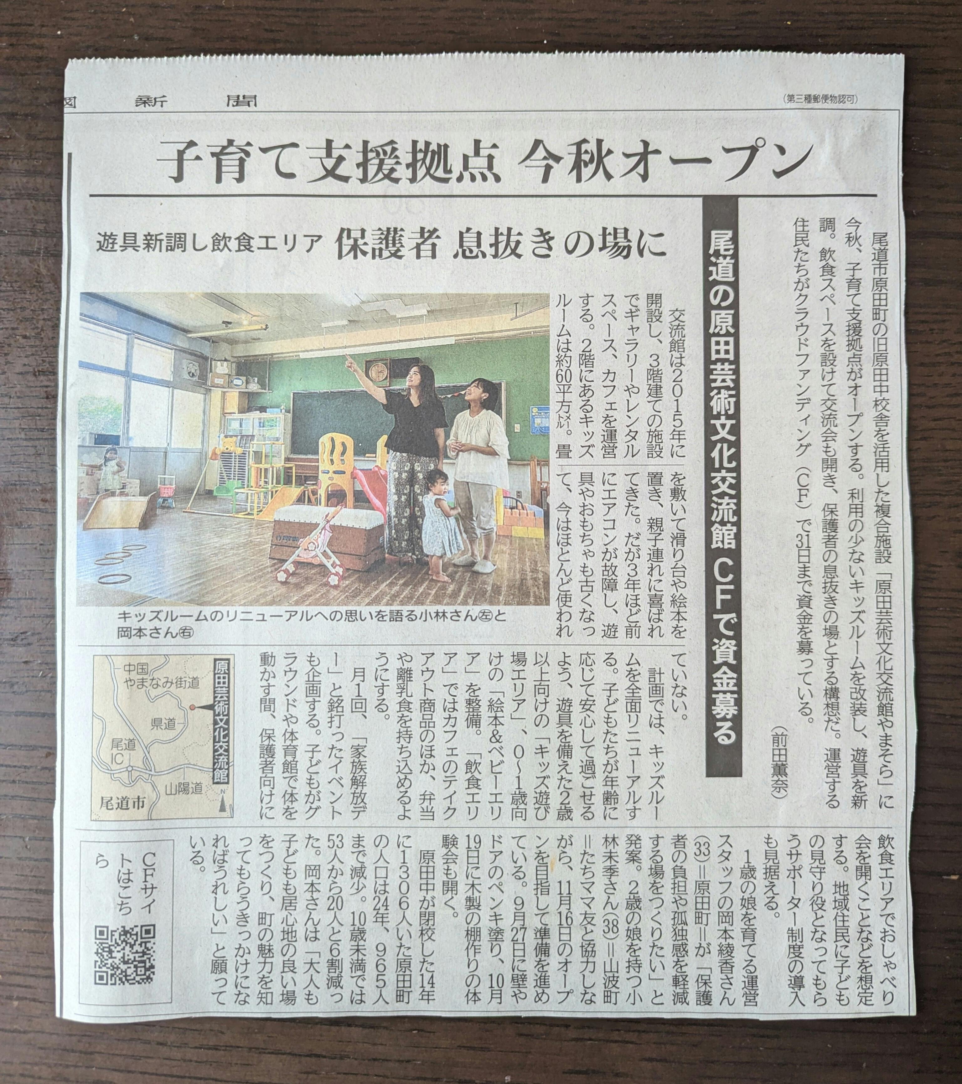 こんにちは!クラウドファンディングの募集も残り1日、いよいよ明日が最終日です。実は数日前にコロナになってしまい、8月の無理が体に出てしまいました…。改めて「無理はいけないな」と実感したところです。『無理なく、自然体で、楽しく』ーーこれは、みぃちるを運営していく上で大切にしたいモットーです。地域活動はどうしてもボランティア精神に支えられる部分が大きいですが、無理して燃え尽きてしまっては続けられません。だからこそ「細く長く、楽しみながら」を心がけたいと思っています。きっかけは「飲食できる場所が少ない」こと今回のリニューアルの大きなきっかけは、「飲食できるスペースをつくりたい」という思いでした。小さい子どもと一緒に食事ができる場所って、尾道には本当に少ないんです。娘が生まれてから、初めてそのことに気づきました。独身時代の私は、尾道をふらりとプチ1人旅して、カフェでのんびり過ごす時間が大好きでした。 広島市に住んでいたときも、友達との待ち合わせはいつもカフェ。美味しいものを飲みながらおしゃべりして、気づけばあっという間に時間が過ぎている――そんなひとときが、一番のリフレッシュでした。でも、ママになった今は違います。 「久しぶりに会おう!」となっても、結局は子供がノンストレスで過ごせる子育て支援センターか、ランチやお茶するなら誰かのお家。尾道のお店はこじんまりとオシャレで素敵だけれど、子連れだとどうしても使いづらい…。最近も、1歳半健診が一緒だったママ友と「仕事も休みだしランチしよう!」と盛り上がったのですが、結局どこに行こうかで悩んでしまいました。こんなふうに何度も思うんです。 「子連れで気軽に行けるカフェがあればいいのに」と。友達や家族と、気軽に「一緒にご飯を食べて、おしゃべりできる場所」。 ママになっても、リフレッシュの為にほんの少しは独身時代の楽しみを味わいたい。――それが、今回のリニューアルの大きなきっかけでした。Perch Cafeでの癒し時間やまそら1階には、常設のカフェ「Perch Cafe」があります。清水さんが淹れてくださるコーヒーは本当に美味しくて、私にとって子育て期間中の憩いの場所です。(ジンジャードリンクも絶品!土日限定で提供されているフードやスイーツも、とってもおすすめです。)娘と2人なら、カフェの中で過ごすのも十分可能。コーヒーを片手に、娘を床で遊ばせながら、清水さんとちょっとしたおしゃべりを楽しんでいると――気づけば「もうこんな時間!」。美味しいものを味わいながら、気軽に会話を楽しめる時間は、子育て中の私にとって本当に幸せそのもの。まさに「美味しいは、幸せ。」だなぁと感じます。でも、ママ友と複数人で行こうとすると、どうしても手狭に。 だからこそ、Perch Cafeの温かくオシャレな雰囲気をそのままに、もう少し広いスペースで楽しめるようにしたい と思いました。飲食OKにするための工夫今年の春には、リニューアル相談のための茶話会を開きました。 午前中の会のあと「せっかくだから一緒にお昼を食べよう」となり、原田町内にあるまなび村さんのお弁当をみんなでいただいたのですが、それがとても楽しかった! 子どもは遊んだりおやつを食べたりしながら、ママさんパパさんと同じ机でご飯を食べて、おしゃべりして…。 「やっぱり一緒に食べるっていいなぁ」と、しみじみ思いました。ただ、飲食OKにするには課題もあります。 例えば、掃除やゴミの片づけのこと。それから、アレルギーを持つ子どもの誤飲リスクです。みぃちるは、基本的に無人のオープンスペースです。だからこそ、掃除をどれだけ行き届かせられるか「やってみないとわからない」部分があり、少し不安に思っています。でも、例えばホテルのロビーでゴミをポイ捨てしようとは思わないように、自然と「きれいに使おう」と思える空間づくりを目指したいです。アレルギー対策については、「アレルギーバッジをつけると安心ですよ」と支援センターの方にアドバイスをいただきました。小さな工夫でリスクを下げられるなら、ぜひ取り入れていきたいです。おかっぱカフェから学んだこと先日、参考に訪ねたのが、愛媛県佐島にある book cafe okappa さん(おかっぱカフェさん)。ご夫婦で営まれていて、お子さん2人の子育て真っ最中。「自分たちが過ごしやすいように」と工夫を重ねておられて、子どもと一緒に行っても、とても居心地がいい空間でした。チャイルドチェアも0歳児用と幼児用の2種類が揃っていて、子ども用の食器やコップもすぐに出してくれる。カフェの1/4ほどがキッズスペースで、おままごとセットやおもちゃが充実! 「カフェだけど子どもが飽きずに遊べる」って本当にありがたい!と思いました。弟ファミリーと行きました!私も経験がありますが、せっかくチャイルドチェアがあっても、子どもはすぐ「立ちたい!出たい!」と駄々をこねるもの。小さい子供は”脱出王”。親はい