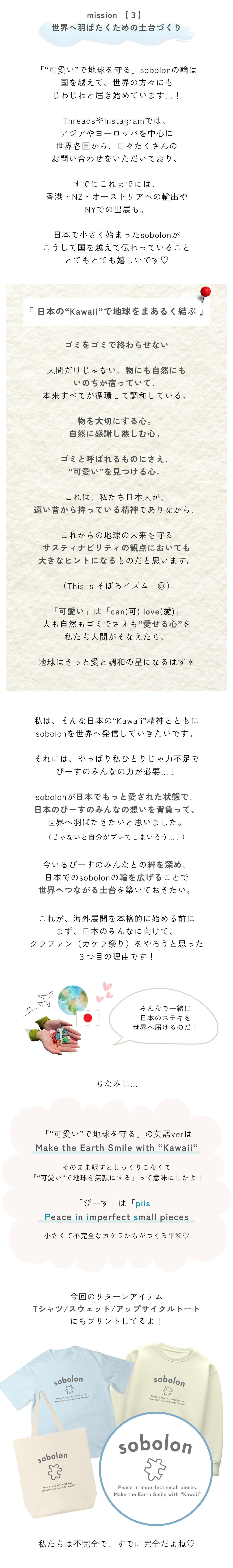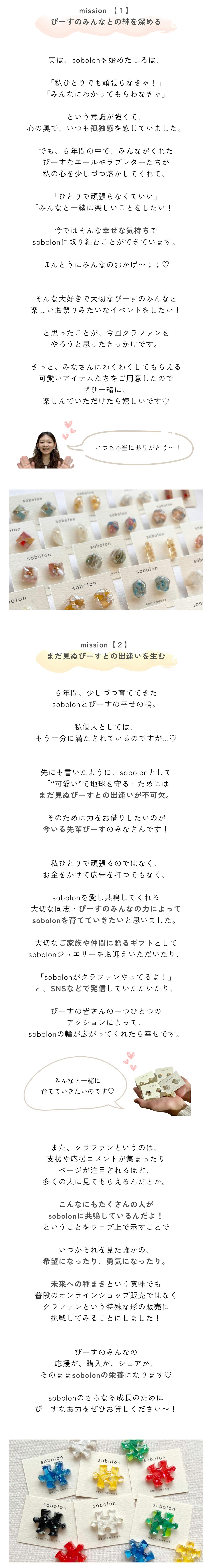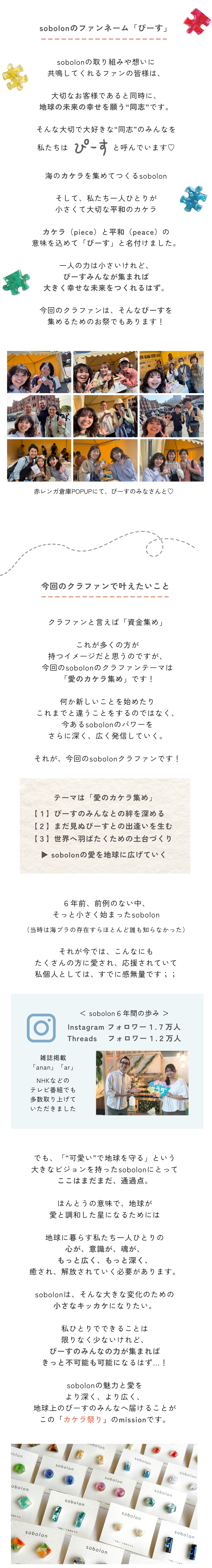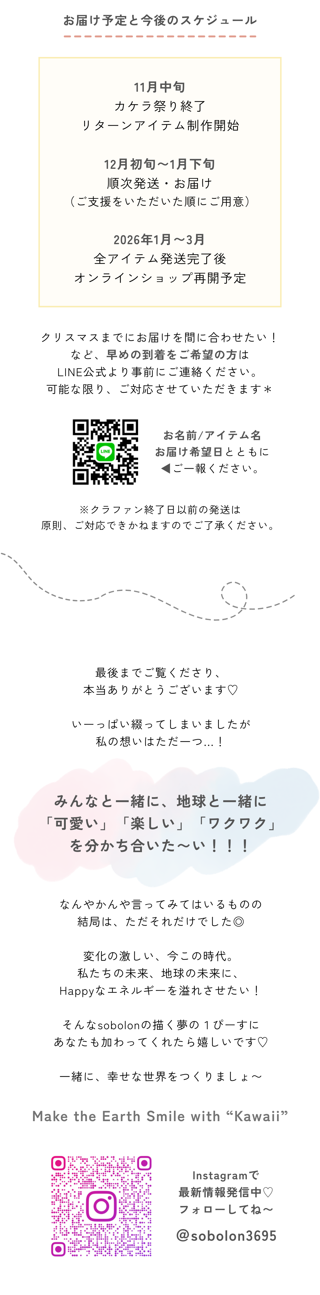 2025/12/06 10:12こんにちは、sobolonひなこです。改めて、このクラファンにご支援いただき本当にありがとうございました!!まず最初に…クラファン終了後のお礼のご挨拶がすごく遅くなってしまい、本当にごめんなさい。sobolonの活動や、私自身の変化が重なり、気持ちと作業が追いつかない時期が続いてしまって、CAMPFIREの方でしっかりご挨拶ができていませんでした。それでも、「sobolonが好き」「応援したい」そんな気持ちで支援してくださった皆さまのおかげで、今回のクラファンを無事に迎えられたこと、改めて心から感謝しています♡そして、いただいたメッセージの一つひとつが胸に沁みていて、応援していただけることのありがたさをいま、すごく実感しています;;リターンアイテムについてですが、現在、順番に準備を進めています。来週より発送作業を開始し、年明け1月には、皆さまのもとへお届け完了させていただく予定です!最後に、今回のクラファンは、ぴーすの皆さまの「想いのパワー」に支えていただいたプロジェクトでした*こんなにも応援してくださっている方たちがいるということが、sobolonの大きな支えとなります。遅くなってしまったけれど、こうして気持ちをお伝えできることに、今はとてもホッとしています。これからも、sobolonらしく、ひとつひとつ丁寧に、大切に、形にしていきますので、どうか見守っていただけたら嬉しいです^^改めて、本当にありがとうございました。これからも、sobolonをどうぞよろしくお願いいたします!sobolon ひなこ もっと見る