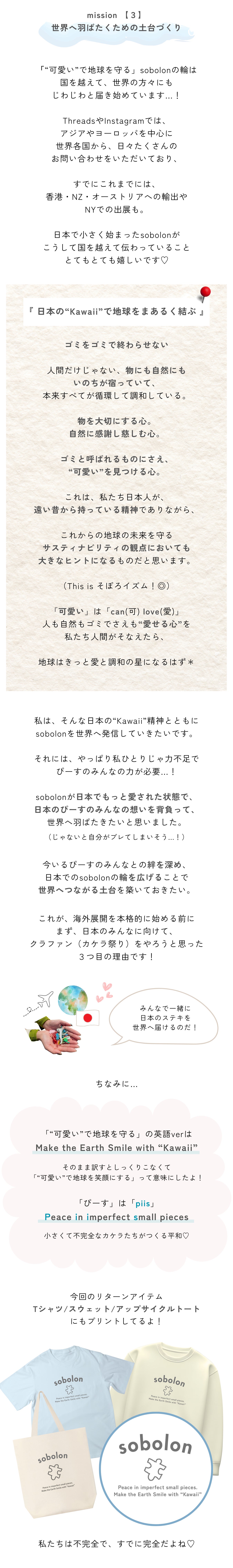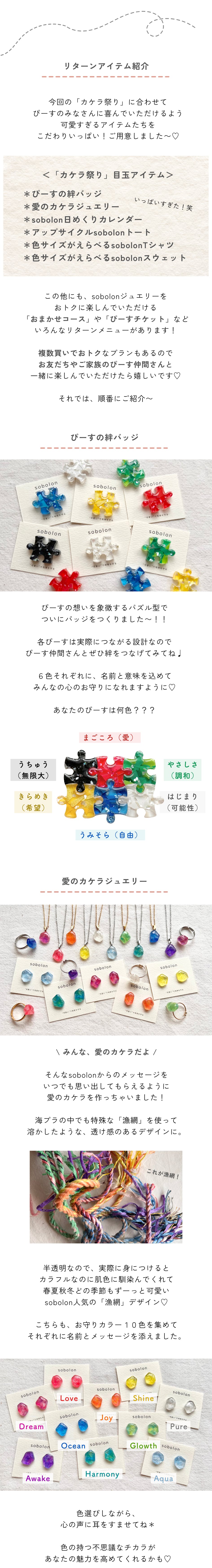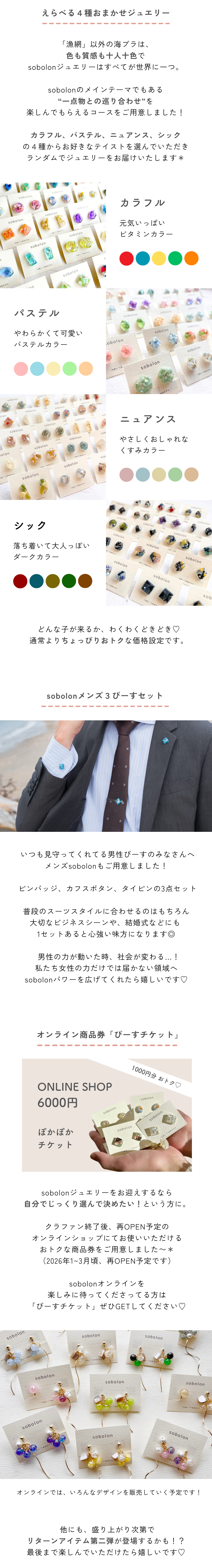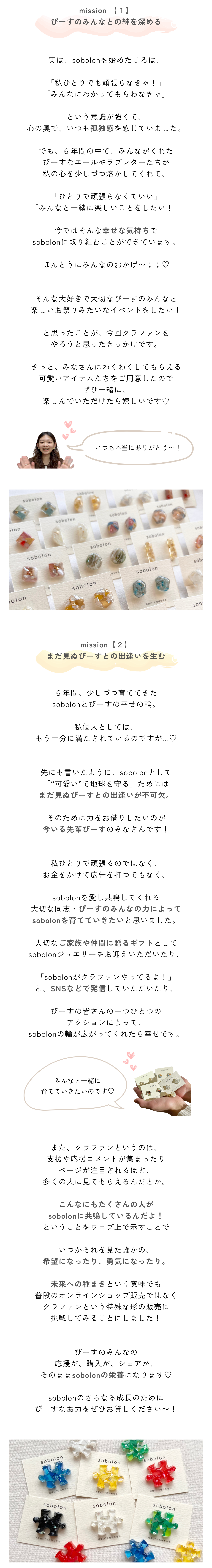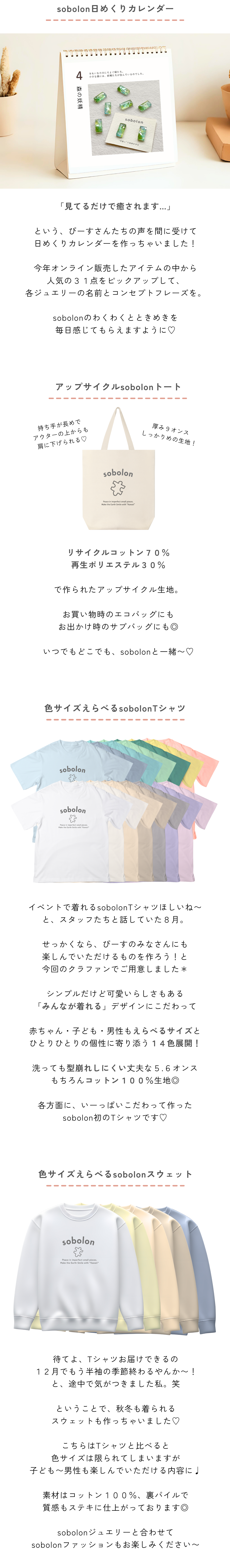 2025/12/09 19:11大変お待たせいたしました!今週末より、リターンの発送を開始させていただきます。ご支援いただいたアイテムによって発送のタイミングが異なりますので、こちらの発送スケジュールをご参照ください。【ジュエリーアイテム各種】ただいま、制作を進めております。ご用意でき次第、順次発送させていただき、〈12月中〉に皆様のもとへお届け完了予定です。【ぴーすチケット】お得なオンライン商品券ぴーすチケットは〈オンラインショップの再開〉までにお送付予定です。再開の日時はただいま調整中のため、今しばらくお待ちください。【クラファン限定アイテム】Tシャツやスウェット、エコバッグなど、ジュエリー以外の限定アイテムにつきましては、受注生産となり制作・手配にお時間がかかりますため、〈年明け1月中〉に皆様のもとへお届け予定です。【セットメニュー】上記3種を含むセットメニューにつきましては各アイテムごとにそれぞれ別の発送となります。セットメニューに含まれるジュエリーアイテムは先立ってお送りさせていただく予定です。改めまして、この度は、誠にありがとうございました!ぴーすの皆さんのおかげで、sobolonがまた一つ前に進むことができたと感じています^^心を込めてご準備させていただきますので、アイテムご到着まで、楽しみにお待ちくださいませ*sobolon ひなこ もっと見るご支援、誠にありがとうございました!