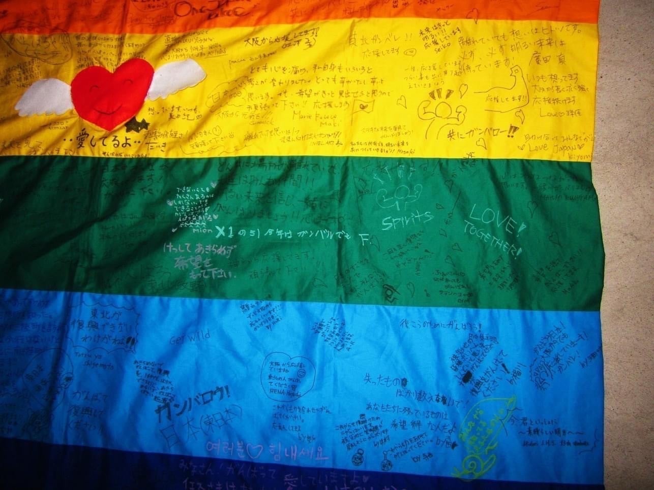 写真は本には全然関係ありませんが、レインボーフラッグ。南三陸の被災地の方々が裁縫されたフラッグです。