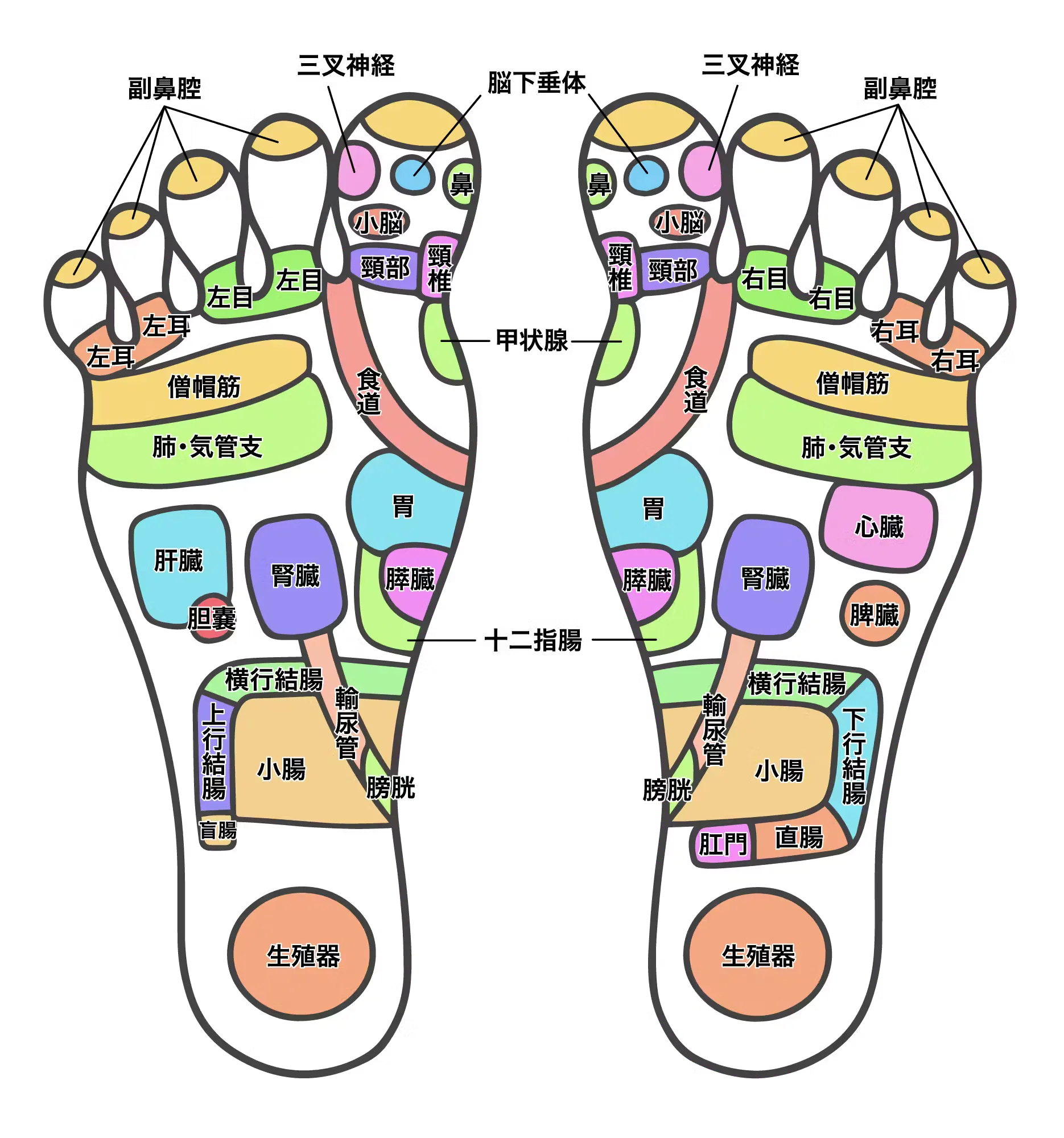 足裏には、60~70個程度の反射区(ツボ)があります。身体の不調が起きた場合、足裏のツボが硬くなったり、カサカサしたり、押すと痛みを感じたりします。この痛みを感じるツボをもみほぐすと、身体の不調を緩和することが可能になります。