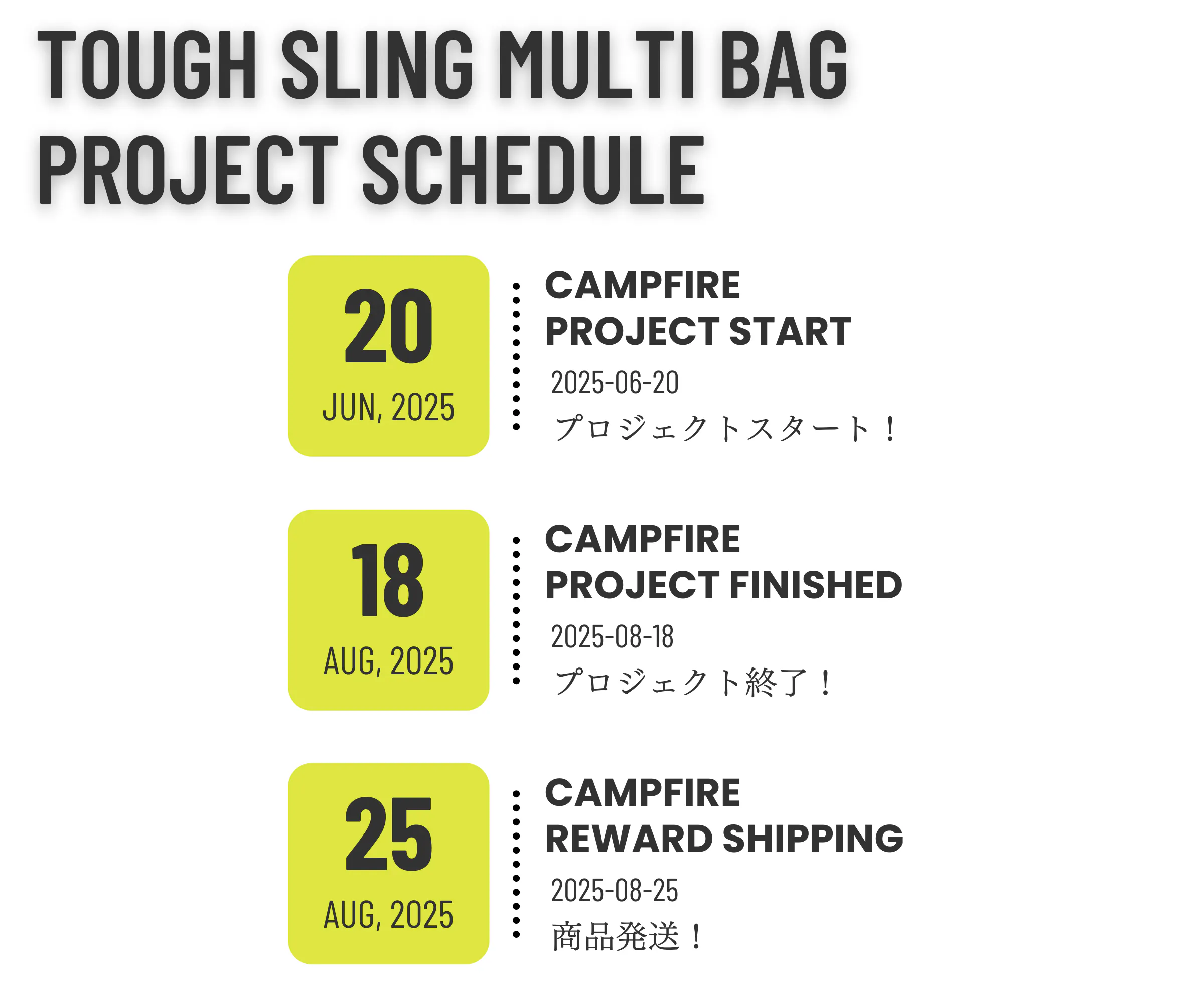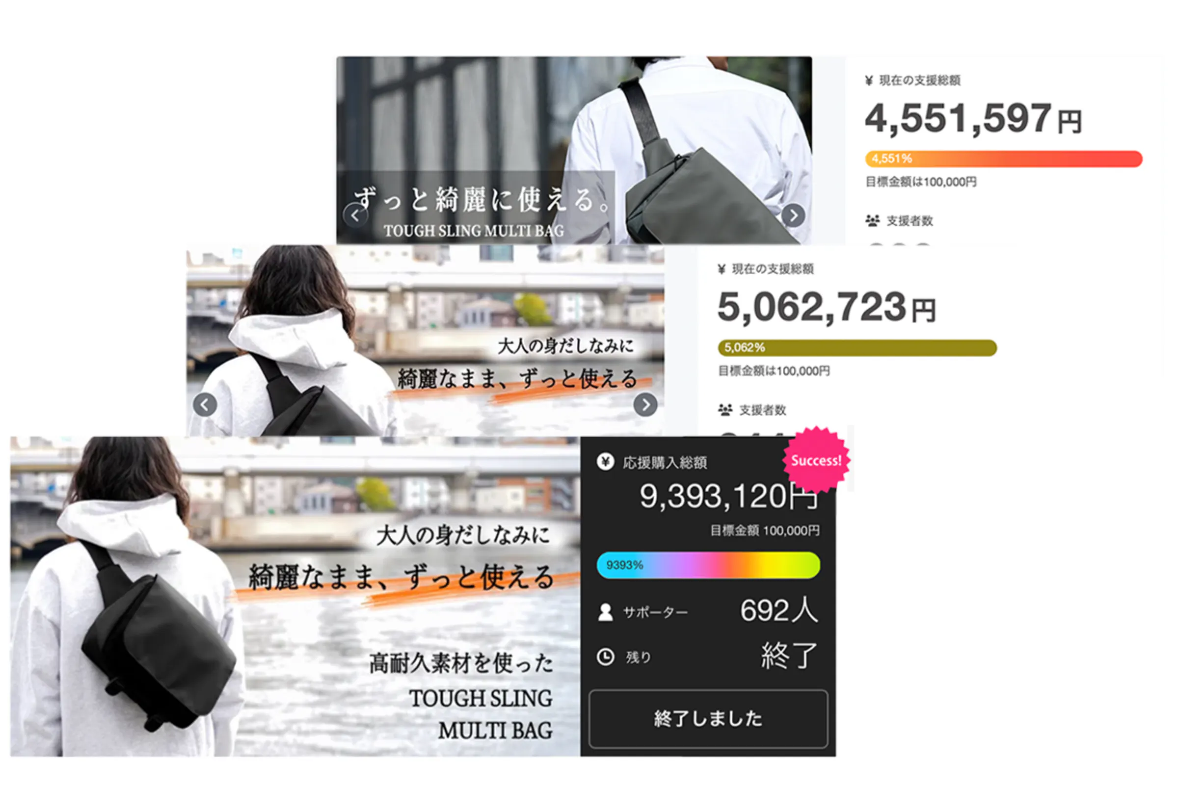 2025/08/19 09:18支援者の皆さま、お世話になっております!TRIDEAL運営の千坂です。TOUGH SLING MULTI BAGのプロジェクトは、昨夜無事に終了いたしました。皆さまからのご支援のおかげで、プロジェクトの目標を達成し、終えることができました。ご支援いただいた皆さま、本当にありがとうございました。リターンについては、来週月曜日の8/25発送を予定しております。明日出荷倉庫にお届け先情報を共有することになっておりますので、購入時からお届け先に変更がある方は、本日中に変更の手続きをお願いいたします!TIMELINE8/18 プロジェクト終了8/19 お届け先情報変更期限※変更がない方は何もする必要がありません。8/20 お届け先情報を倉庫に共有8/25 リターン発送※発送元:大阪 / 配送会社:佐川急便お客様都合で再配達になった場合の再配達は、着払いでの発送になってしまいますので予めご了承くださいませ。それではお手元に届くまで、もう少しだけお時間をいただきますが楽しみにお待ちいただけると嬉しいです。今後とも、どうぞよろしくお願いいたします。TRIDEAL 千坂■CAMPFIREで実施中のプロジェクト■綺麗が持続する。色褪せず、傷にも強い。高耐久でタフに使えるショルダー型トート商品ページ:https://camp-fire.jp/projects/856705/view「長年綺麗に使える」ノートPCもスッキリ入る。汚れにくく傷にも強いスリングバッグ商品ページ:https://camp-fire.jp/projects/825373/view もっと見る