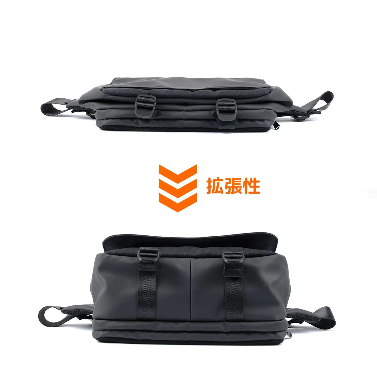 拡張が出来ることで、普段は必要最低限の荷物で身軽に出かけて、荷物が増えた時も拡張することで対応ができるので、いつでもこのバッグ一つで出かけられる設計になっています。