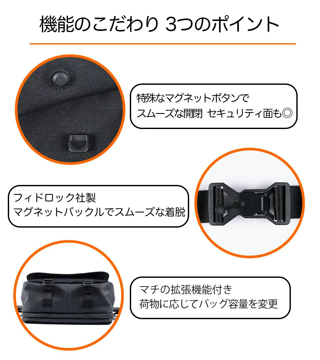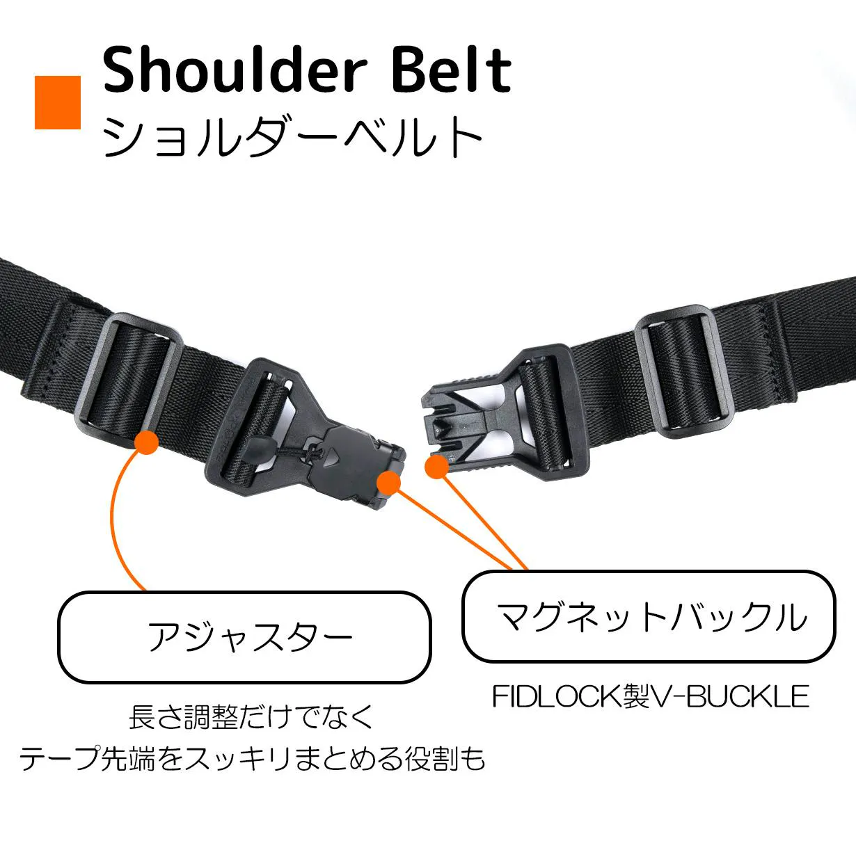 ショルダーベルトには、ドイツのパーツブランド、フィドロックのマグネットバックルを使用しています。