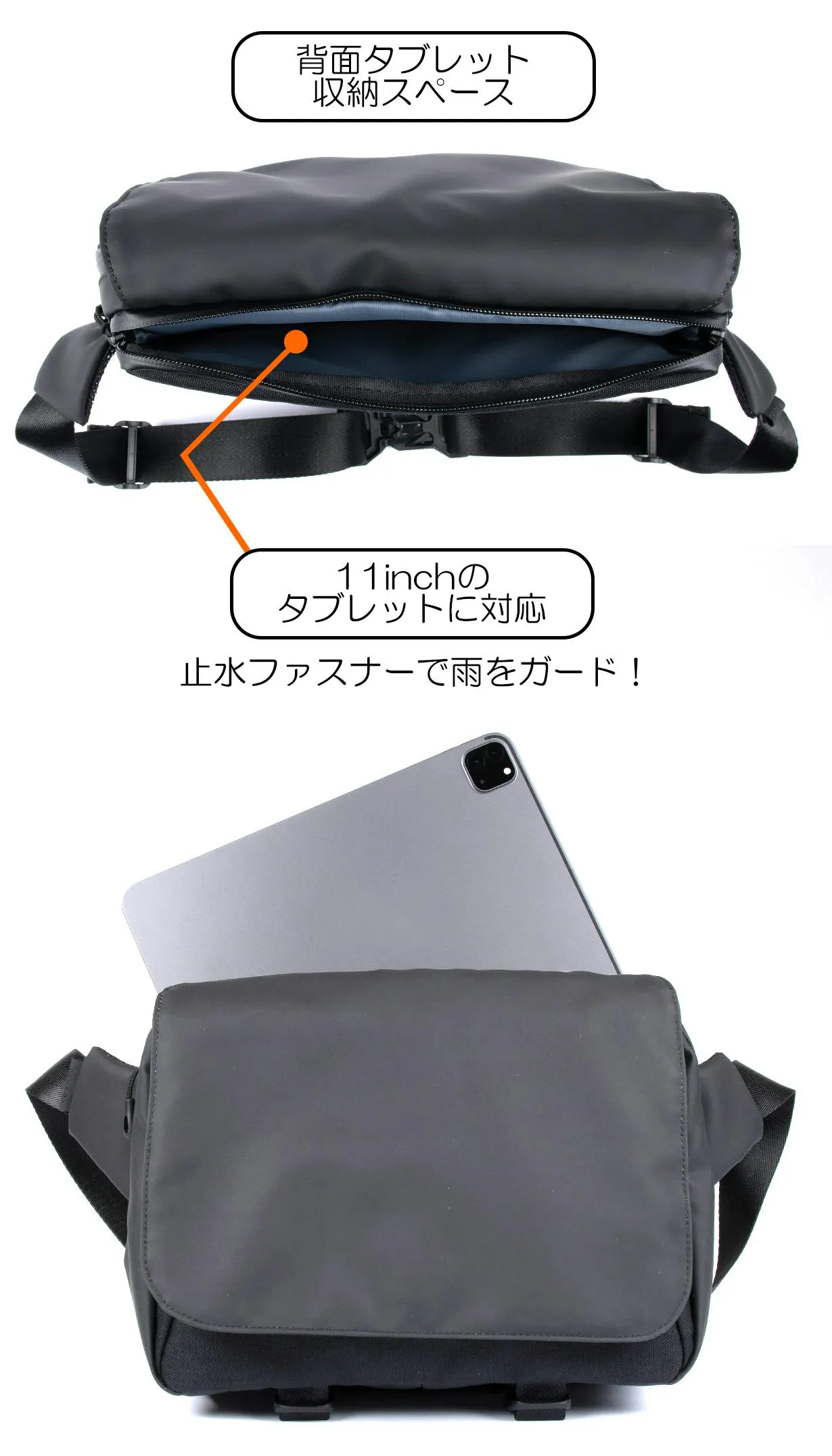 A:はい、11インチまでのタブレットを収納できる専用ポケットが装備されています。