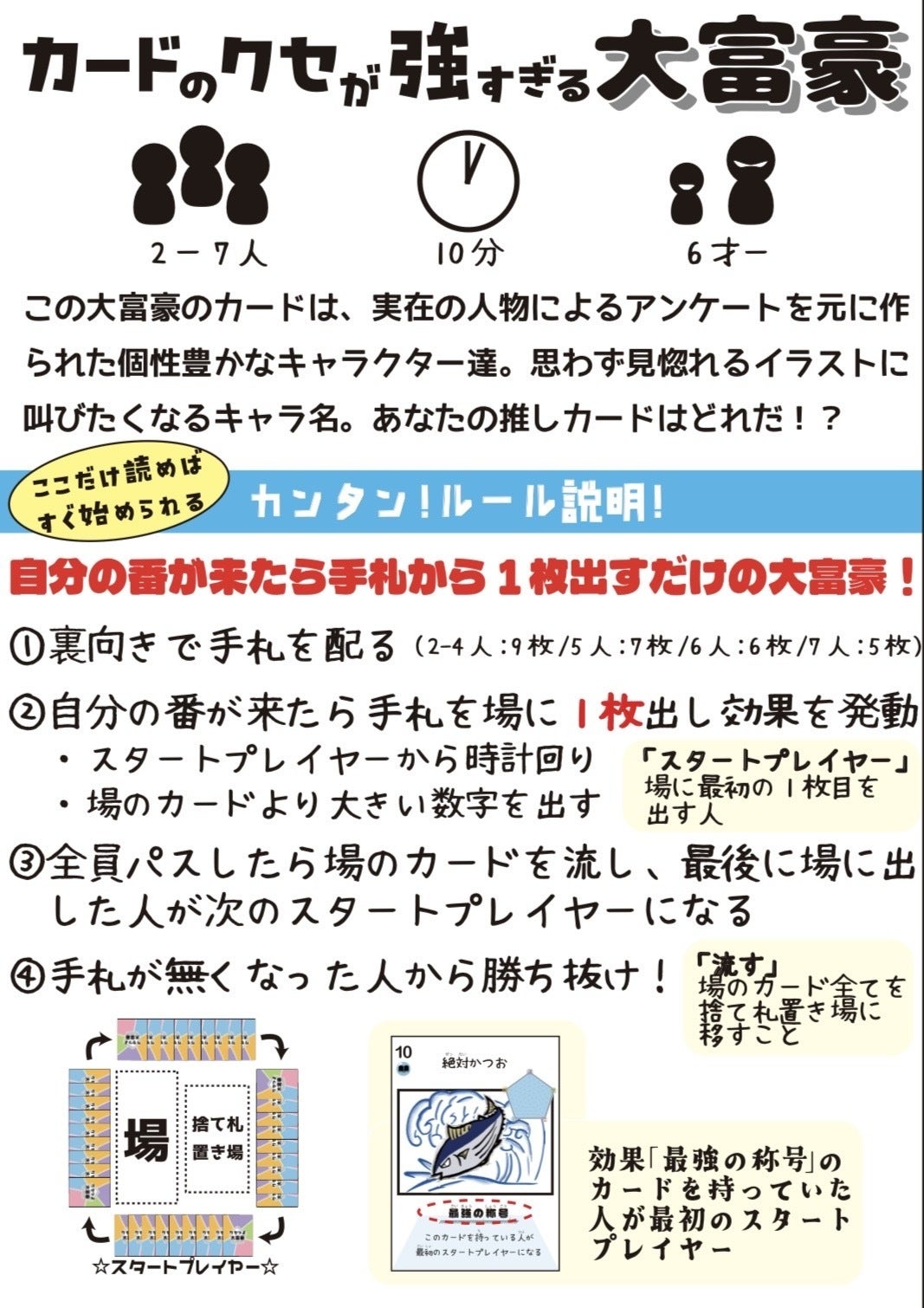 2026/02/18 22:054toT制作より活動報告です。まず、完成が大幅に遅れてしまっており大変申し訳ありません。ボードゲーム制作は着実に進めており、ゲーム名とルールは決定。現在はルールの最終調整と、説明書の確認作業、箱のデザインなどを進めています。決定したゲーム名は、「カードのクセが強すぎる大富豪」です!画像は作成中の説明書の一部です。皆さまのアンケート結果を反映できて、かつ、支援者の方々および支援者の周りの方々が楽しめるルールは何か?支援者さまが周りの方を自信を持って誘えるルールは何か?考えに考え、試作を重ね、テストプレイを重ねた結果、トランプゲームの1つ「大富豪」を踏襲することにしました。しかしルール自体は大富豪よりもシンプル。「自分の番が来たら1枚出す」のみです。しかしカード毎に、今までの大富豪にない、シンプルで斬新な効果を付けています。しかもアンケート結果を反映しつつ!!!ゆっくりですが、着実に進めています。カード毎の効果も楽しみにお待ちいただければ幸いです。 もっと見る