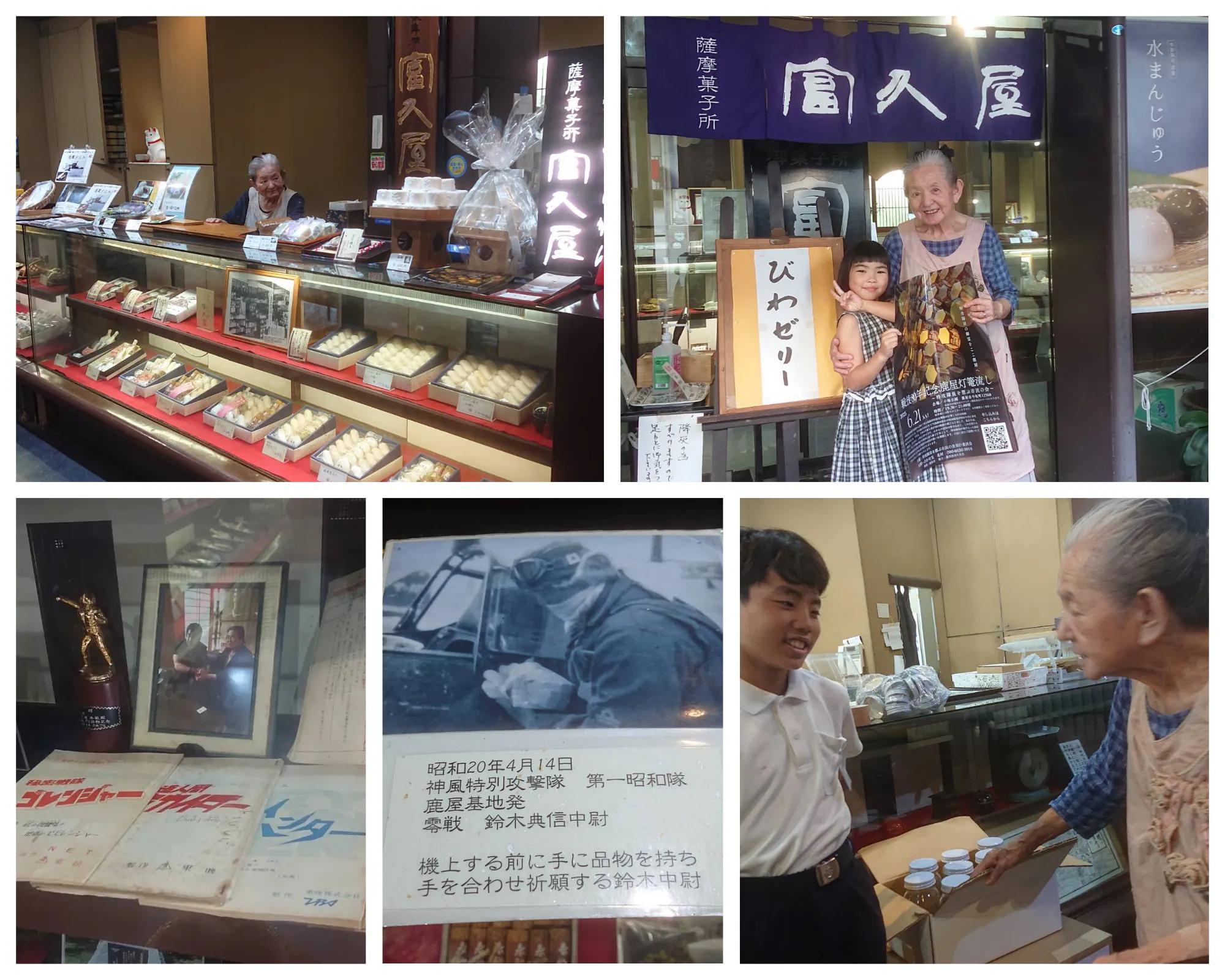 海軍タルトはスポンジ生地であんを挟んだ細長いお菓子で、老舗和菓子屋での修行をされた職人さん達で味を守っています。真ん中の下は薩摩えぞの社員濱田ゆかりさん。女将のお店を無償で手伝い続けて、包装等をボランティアしてくれています。