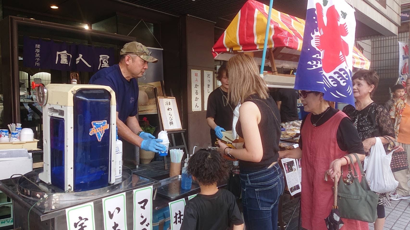 「しんこだんご」や「冷やしぜんざい」を手に、通りすがりの親子連れや観光客の皆さんが笑顔を見せてくれました。
