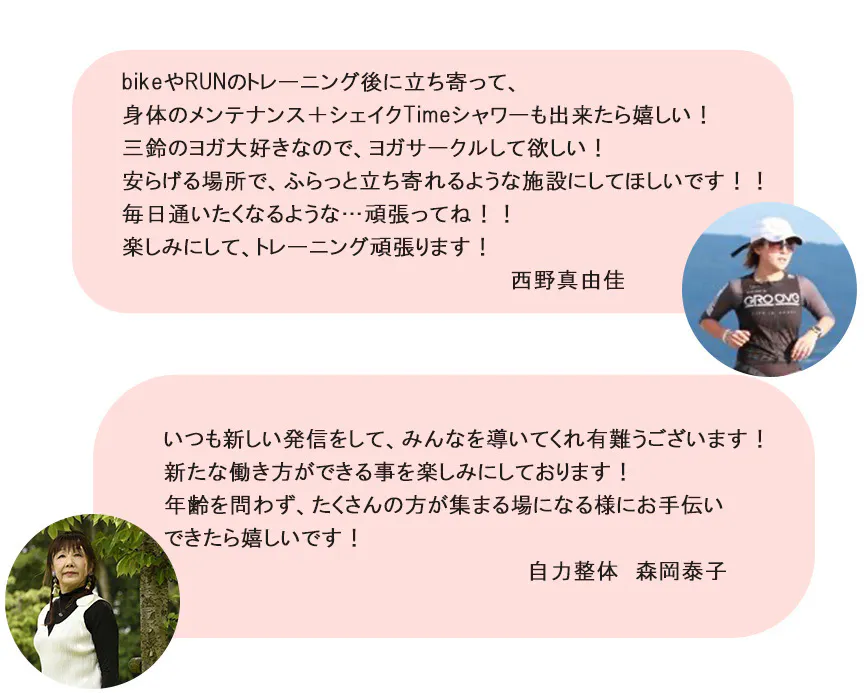 妊婦さんから赤ちゃんキッズたちを健康に、40代以降の更年期世代の心のケアを、シニア世代はアクティブシニアへと年代に応じた対応が運動、栄養、コミュニティを通じてできる場所を作りたい。
